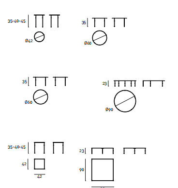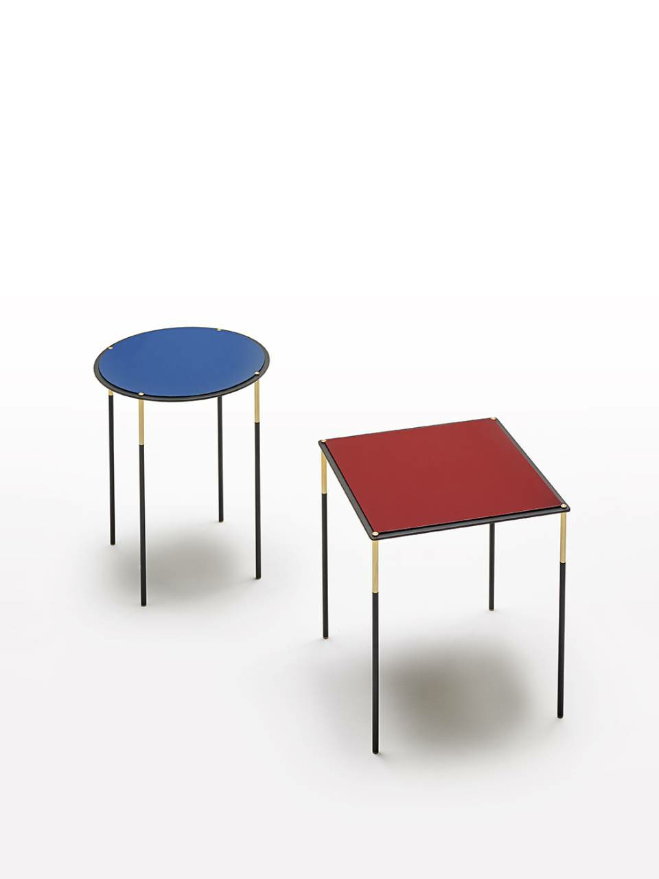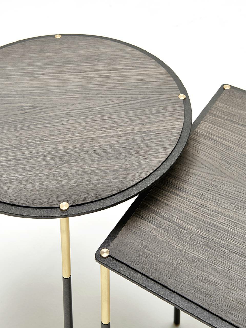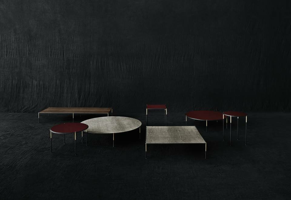 Family of 7 tables of different shapes and sizes, consisting of a sheet steel frame 5mm thick, laser cut in one piece, on which is fixed a contoured HPL top 8mm thick, veneered in Stone Oak?, Thermo oak or walnut lacquered “Canaletto”, or polished in the finish RAL K-7 3005 Wine Red e RAL K7 5020 Ocean Blu. Legs in tubular steel ? 12mm with inset h.11cm and foot in brass, secured to the steel frame through a threaded tie rod and a brass bolt. Floor support secured by black PVC feet. All metal parts, coated with epoxy powder gunmetal grey colour. Brass spacers, feet and bolts, with matt lacquer finish.