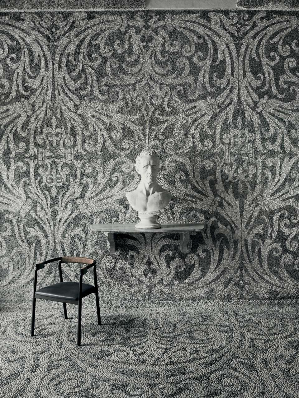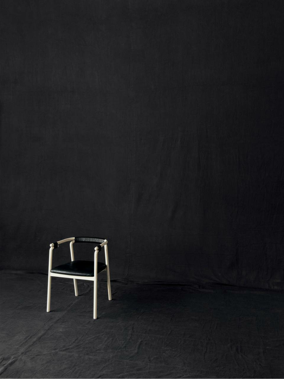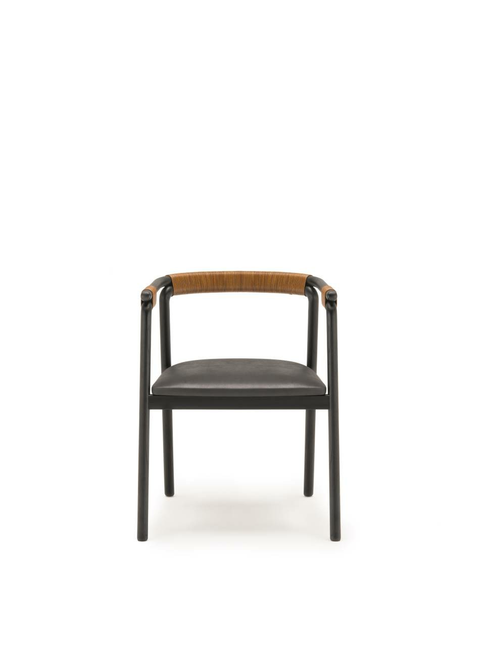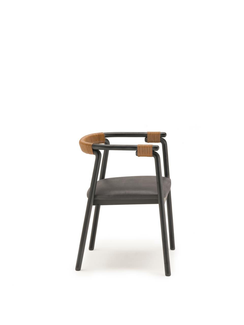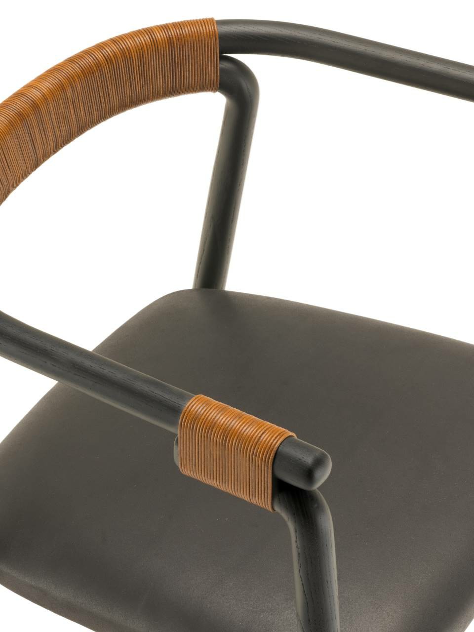 Chair available for indoor and outdoor. Indoor version: in solid ash wood ?30 mm with acrylic painting finish natural colour and with acrylic water-based finish, or charcoal-dyed, with acrylic base and acrylic painting finish. Seat chassis in multilayer sprung with coated rubber elastic straps, padded in polyurethane foam covered with acrylic fibre layers. Indoor/Outdoor version: with tubular frame ?22 mm in stainless steel AISI 316 lacquered with epoxy powder coating gunmetal grey colour; seat chassis in plywood for outdoor use, sprung with coated rubber elastic straps, padded in open cell structure polyurethane foam DRYFEEL S covered with fibres for outdoor and with a heat-sealed waterproof fabric cover. Decorative weave for backrest and armrests with profile in hide cellulose cord or waxed rope for outdoor use, in the colours of collection. Non-removable seat upholstery in fabric or leather; for the outdoor version, in outdoor fabrics only. Floor support secured by black PVC feet.