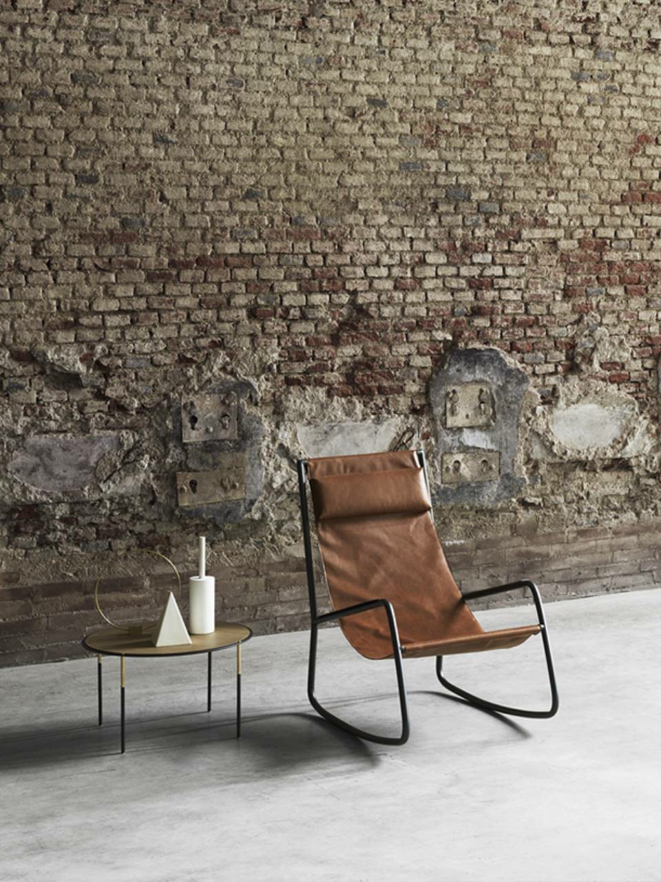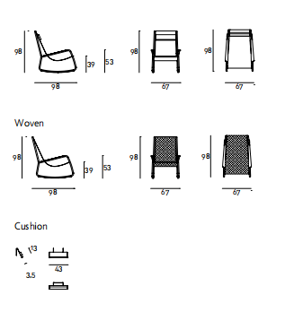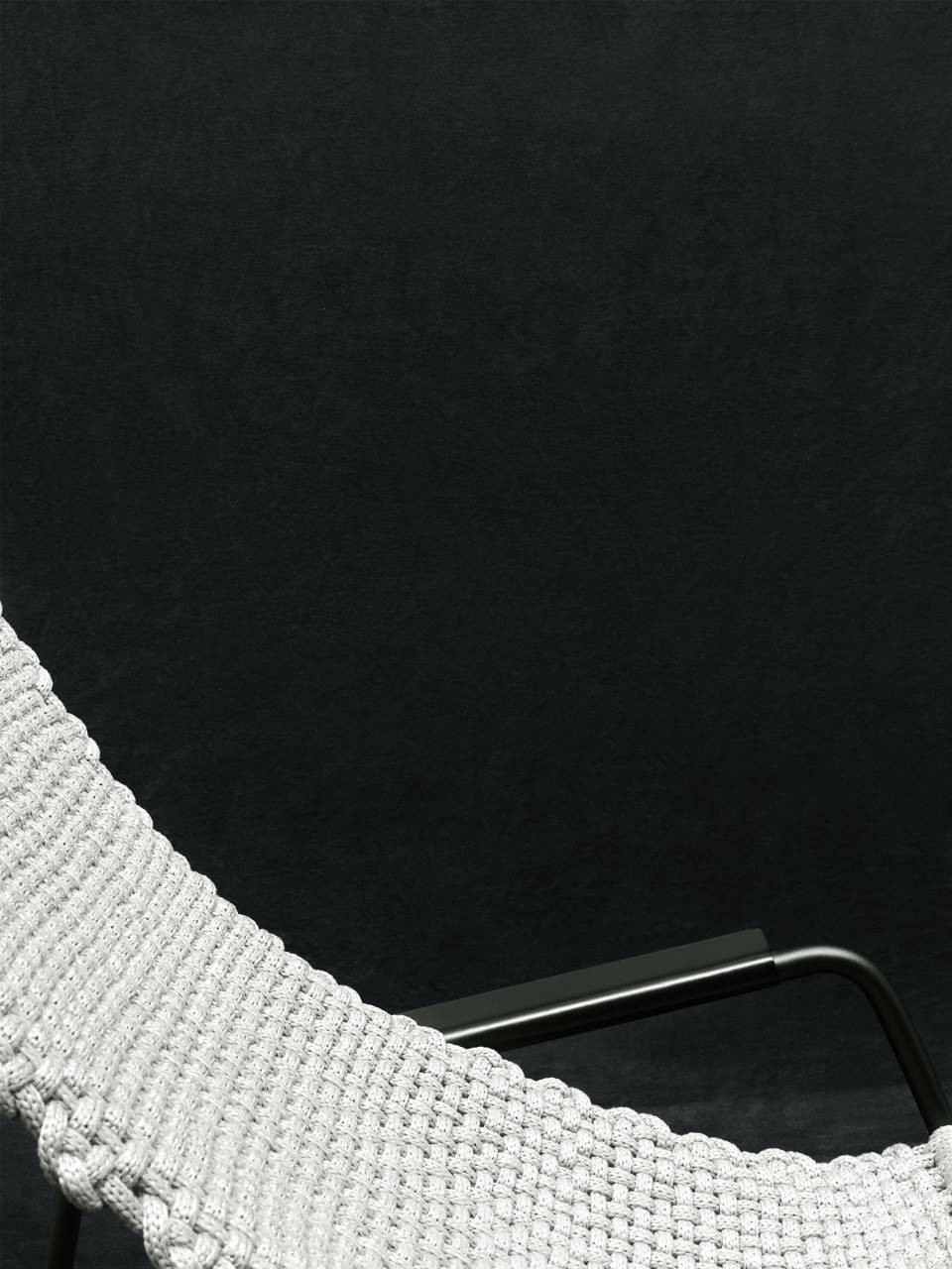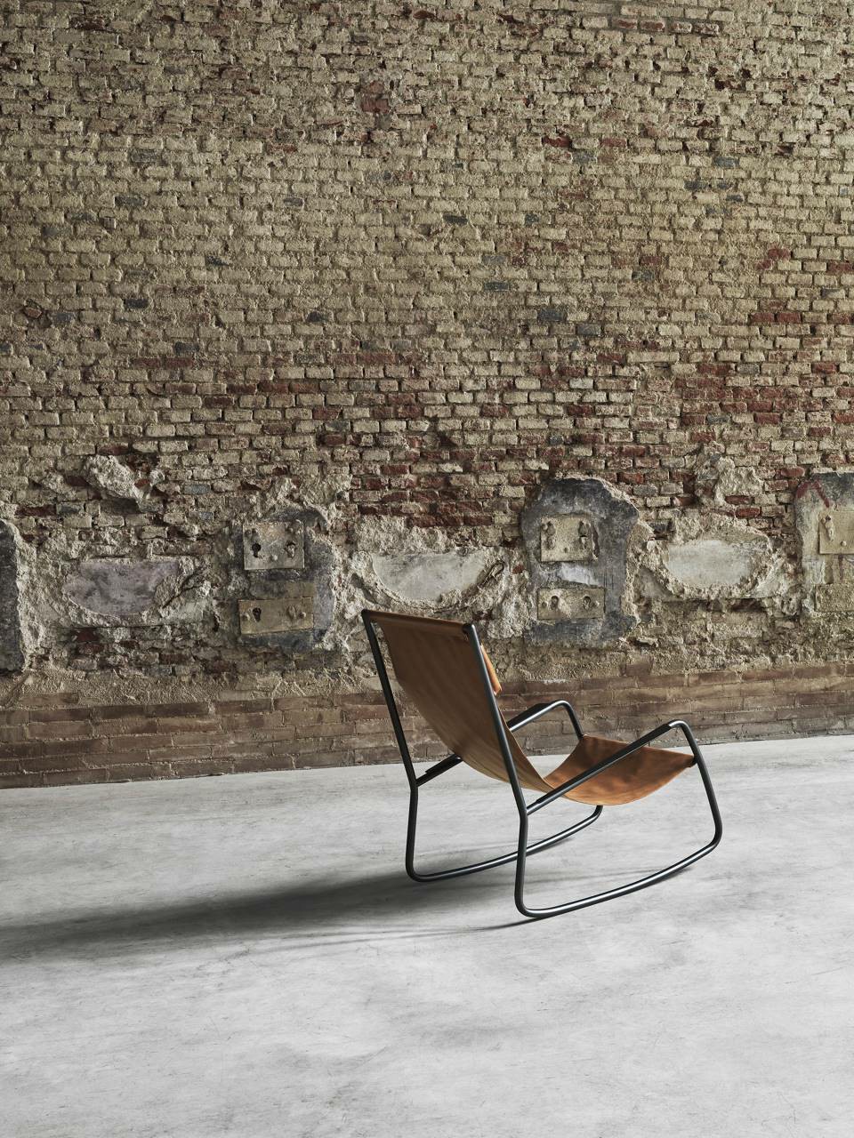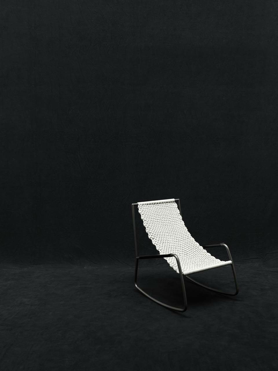 Rocking Chair available for indoor and outdoor. Indoor version: supporting frame in ? 25mm tubular steel coated with polyester epoxy powder gunmetal grey colour and black PVC runners. Non-removable upholstery, hooked to the frame through technical parts coupled to it, available in fabric or leather sewn together with a supporting material. Headrest in polyurethane foam covered with acrylic fiber layers, integrated into the upholstery. Small armrest in stainless stell AISI 316, secured to the frame with stainless stell screws, coupled with non-removable black hide or coated with polyester epoxy powder gunmetal grey colour. Outdoor version: supporting frame in ? 25mm tubular Stainless steel AISI 316 coated with polyester epoxy powder gunmetal grey colour and black PVC runners. Non-removable upholstery hooked to the frame through technical parts coupled to it, available in the outdoor fabrics only, sewn together with a supporting material. Headrest padded with DRYFEEL S and outdoor fiber layers, integrated into the upholstery. Small armrests in Stainless steel, secured to the frame with Stainless steel screws, coated with polyester epoxy powder gunmetal grey colour. For both versions, upholstery available woven (Readymade UNpizzo), with a non-removable an hypoallergenic, recyclable, eco-friendly tubular, suitable both for indoor and outdoor, in the colours in collection. For the woven version only, additional headrest, not integrated into the upholstery, in polyurethane foam covered with acrylic fiber layers for the indoor version and, padded with DRYFEEL S and outdoor fiber layers, for the outdoor version.