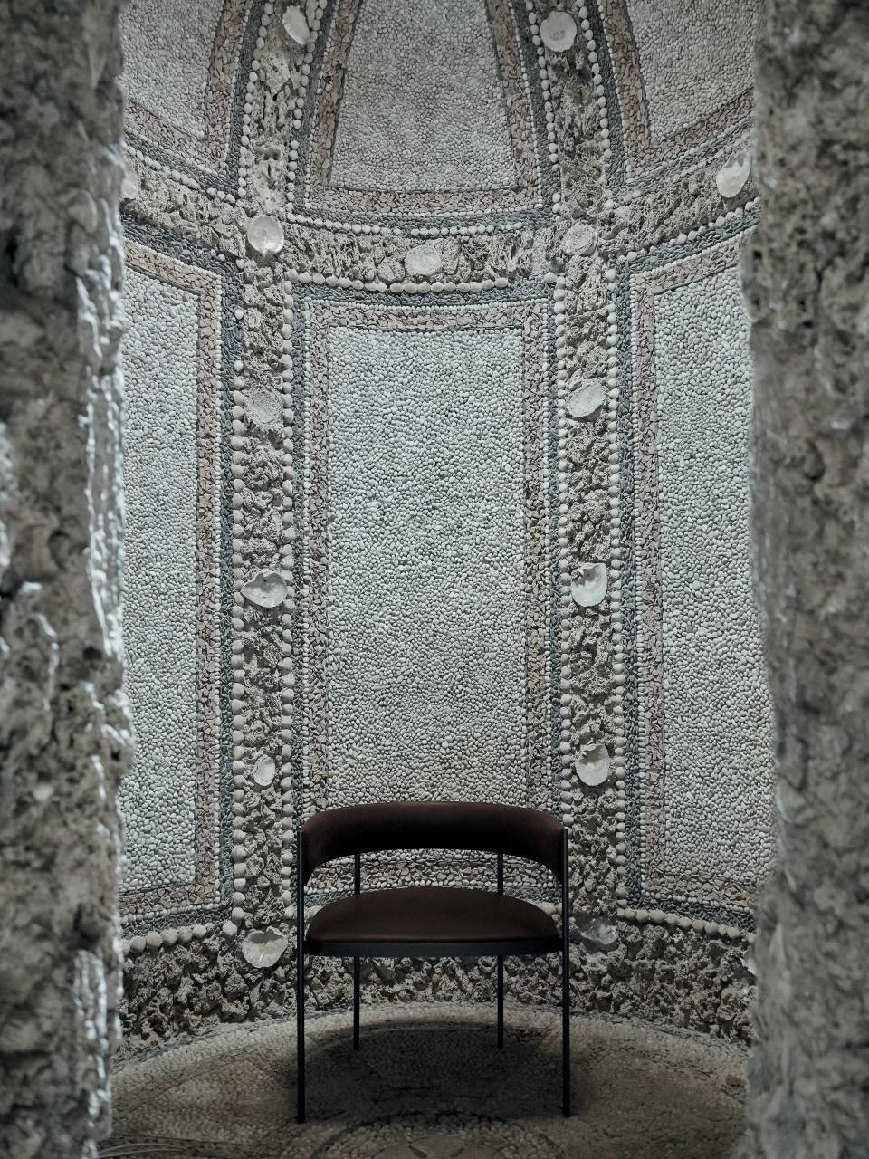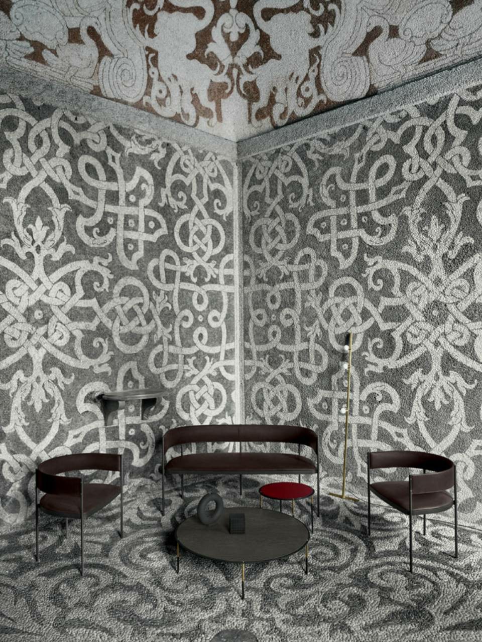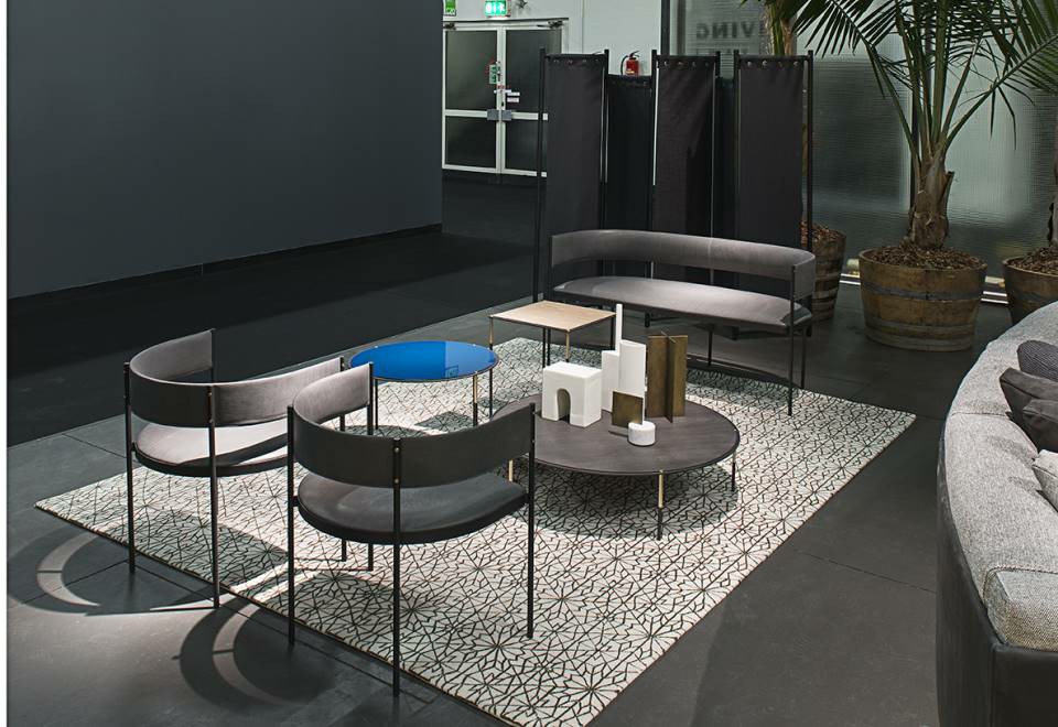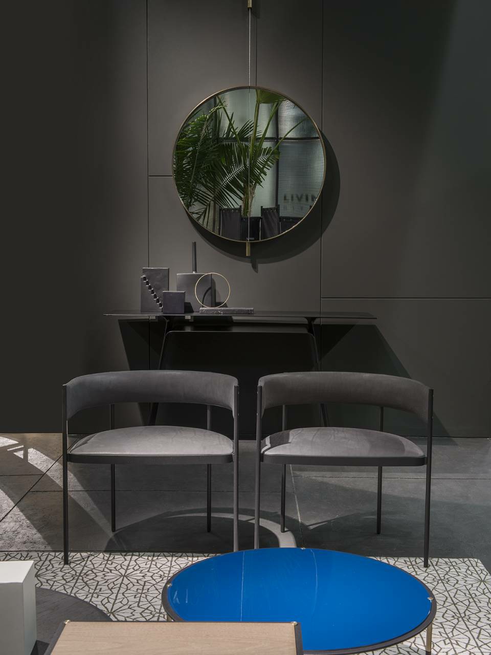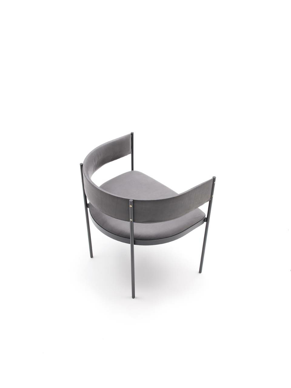 Easychair consisting of ?16 mm steel rod legs, tied together through a contoured sheet-steel ring 4 mm thick, laser cut in one piece, to which is welded a drawn and calendred steel plate section 30x4 mm, which serves as seat chassis. Seat panel in multilayer poplar wood, sprung with coated rubber elastic straps, and padding in polyurethane foam covered with acrylic fibre layers. Backrest consisting of a calendred sheet-steel band 1,5 mm thick, padded with polyurethane foam, inserted to the legs through a mill in the front part, and secured to the legs through brass screws, made on specific design. All steel part, aside from the screws in brass with matt lacquered finish, are coated with epoxy powder coating gunmetal grey colour. Non-removable fabric or leather upholstery. Floor support secured by black PVC feet.
