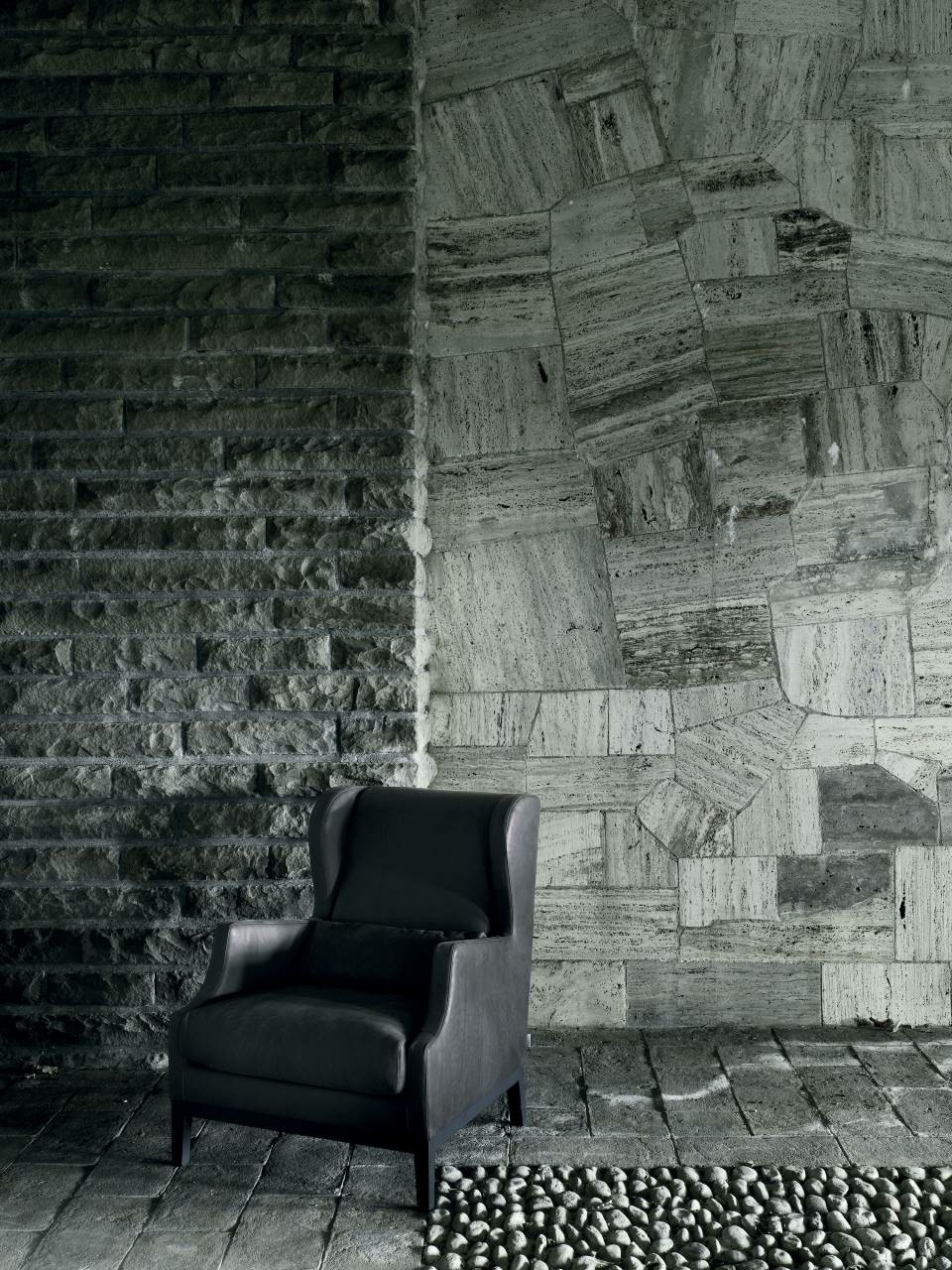 Bergère armchair with frame in poplar and pine plywood. Support in cross-woven, coated rubber elastic straps. Frame padding in differentiated density polyurethane foam. Covering in needle punched, resinated, non-woven polyester fibre, bonded onto a polyamide velveteen backing. Seat cushion in prewashed and sterilized goose down, stitched into separate compartments with insert in polyurethane foam. Base in solid oak wood with acrylic painting, natural polished or charcoal dyed. Fabric or leather upholstery. The fabric version only is also available with flounce 12cm from the floor and is fully removable by zippers and Velcro fastenings. The leather version is always without flounce and non-removable upholstery. Seat depth 60cm.