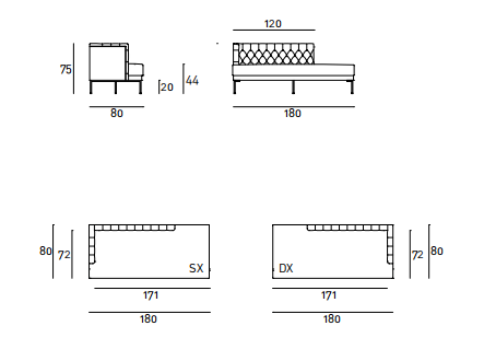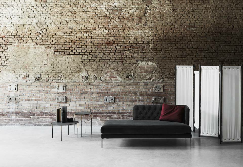 Dormeuse with armrest and backrest frame in multilayer poplar wood and padding, with “capitonné” working, in differentiated density polyurethane foam with acrylic fibre layers. Seat chassis in 50x30mm tubular steel with black epoxy powder coating, sprung with coated rubber elastic straps and padded in polyurethane foam covered in 100% polyether thermally bonded onto a polyamide velveteen backing. Seat cushions in differentiated density polyurethane foam and Visco-soft covered with acrylic fibre layers. Tubular steel feet, joined by a bracket in square section 15x15mm, with epoxy powder coating burnished color with adjustable black PVC tips. Armrest and backrest upholstery, with capitonné working, non-removable in both leather or fabric version; seat cushion upholstery in fabric or leather, both fully removable by zippers.