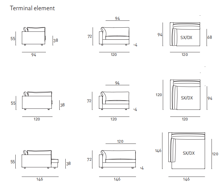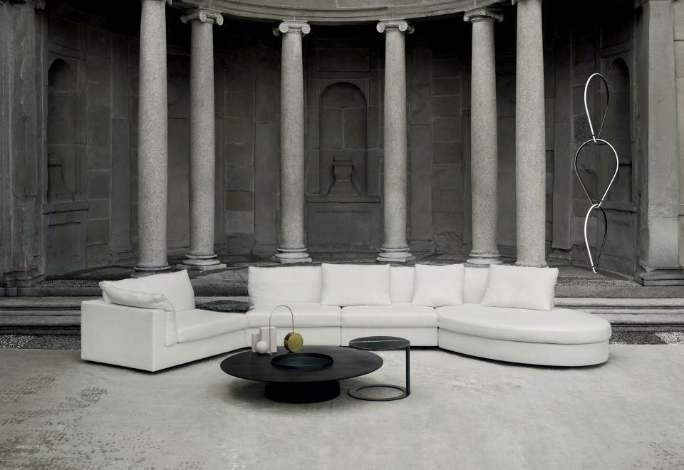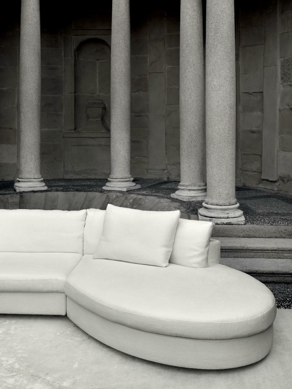 Modular elements of different sizes with structure in doublepanelled poplar and fir-wood and padding in differentiated density polyurethane foam, covered with acrylic fibre layers. Base sprung with coated rubber elastic straps, padded in polyurethane foam covered in 100% polyether thermally bonded onto a polyamide velveteen backing. Backrest and armrest cushion in prewashed and sterilized goose down, stitched into separate compartments, with polyurethane foam insert. Seat cushion in differentiated density polyurethane foam and Visco-soft insert, covered with acrylic fibre layers. Black adjustable PVC feet. Fabric or leather upholstery, both fully removable by zippers and Velcro fastenings. The various elements are joined together by means of hooks.