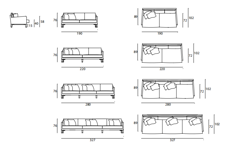 Sofa with backrest frame in double-paneled fir-wood and armrest and seat frame in multilayer poplar wood, padded in polyurethane foam covered with acrylic fiber layers. On the front part of the seat frame is fixed a 3mm steel sheet, coated and shaped according to specific design, covered with acrylic fiber layers. Seat chassis, inserted into the base, in 40x30mm tubular steel, with epoxy powder coating, sprung with coated rubber elastic straps; padding in polyurethane foam covered in 100% polyether thermally bonded onto a polyamide velveteen backing. Seat cushions in differentiated density polyurethane foam and Visco-soft, covered with prewashed and sterilized goose down, stitched into separate compartments and covering in needle punched, resinated, non -woven polyester fiber, bonded onto a polyamide velveteen backing. Backrest cushion in prewashed and sterilized goose down, stitched into separate compartments, with polyurethane foam insert. Fabric upholstery fully removable by zippers and Velcro fastenings. Fix leather upholstery for structure only. Tubular steel feet ?30mm, joined by a bracket, with bronzed epoxy powder coating or feet in solid wood veneered Stone Oak?, screwed to a tubular steel bracket, rectangular section 25x15 mm, painted with matt black epoxy powder; both versions with black PVC tips.