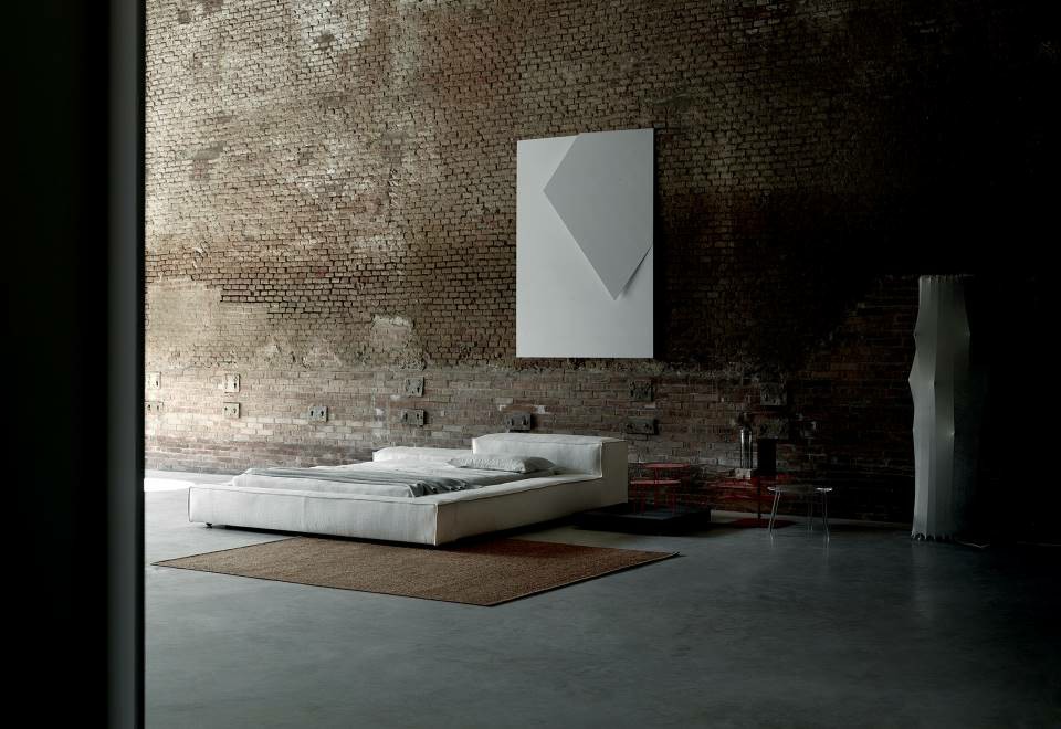 Bed with headboard and bedstead structure in double-panelled  poplar and pine. Padding in differentiated density polyurethane  foam. Quilted mat in prewashed and sterilized goose down,  stitched into separate compartments. Covering in needle  punched, resinated, nonwoven polyester fibre, bonded onto  a polyamide velveteen backing. Black adjustable PVC feet.  Black lacquered metal frame for bed assembly and slat base  support. Fabric or leather upholstery, both fully removable  by Velcro fastenings.