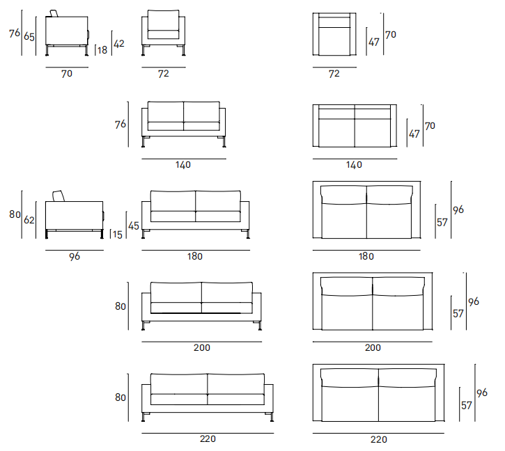 Fix or modular sofa and armchair with one-piece frame in double-paneled poplar and pine. Support in cross-woven, coated rubber elastic straps. Shell padding in differentiated density polyurethane foam. Covering in needle punched, resinated, non-woven polyester fibre, bonded onto a polyamide velveteen backing. Seat and back cushions in prewashed and sterilized goose down, stitched into separate compartments, or with preformed structure in differentiated density polyurethane foam, coated with acrylic fibre layers. Chromed steel feet or, on request, with satin nickel finish joined by a bracket. Fabric or leather upholstery. The fabric version only is available with flounce 9cm from the floor and is fully removable by zippers and Velcro fastenings. The leather version is always without flounce and non-removable upholstery. Seat depth 47-57cm.