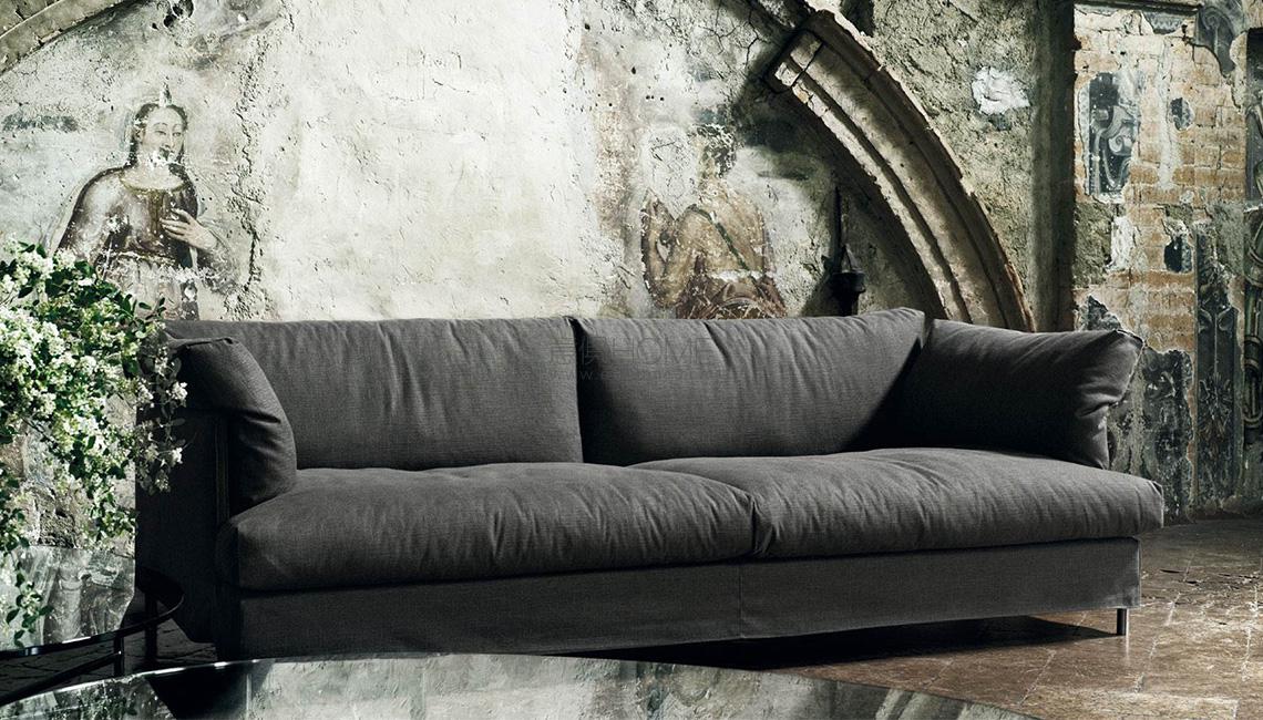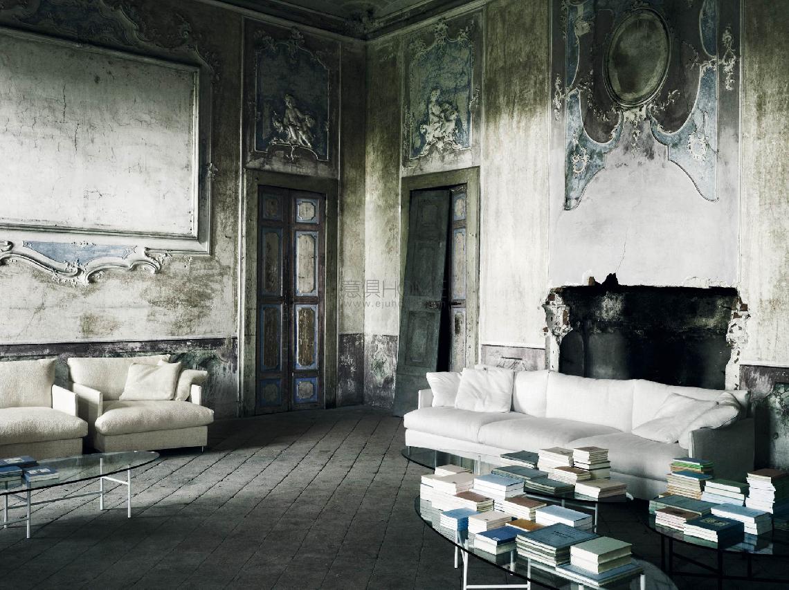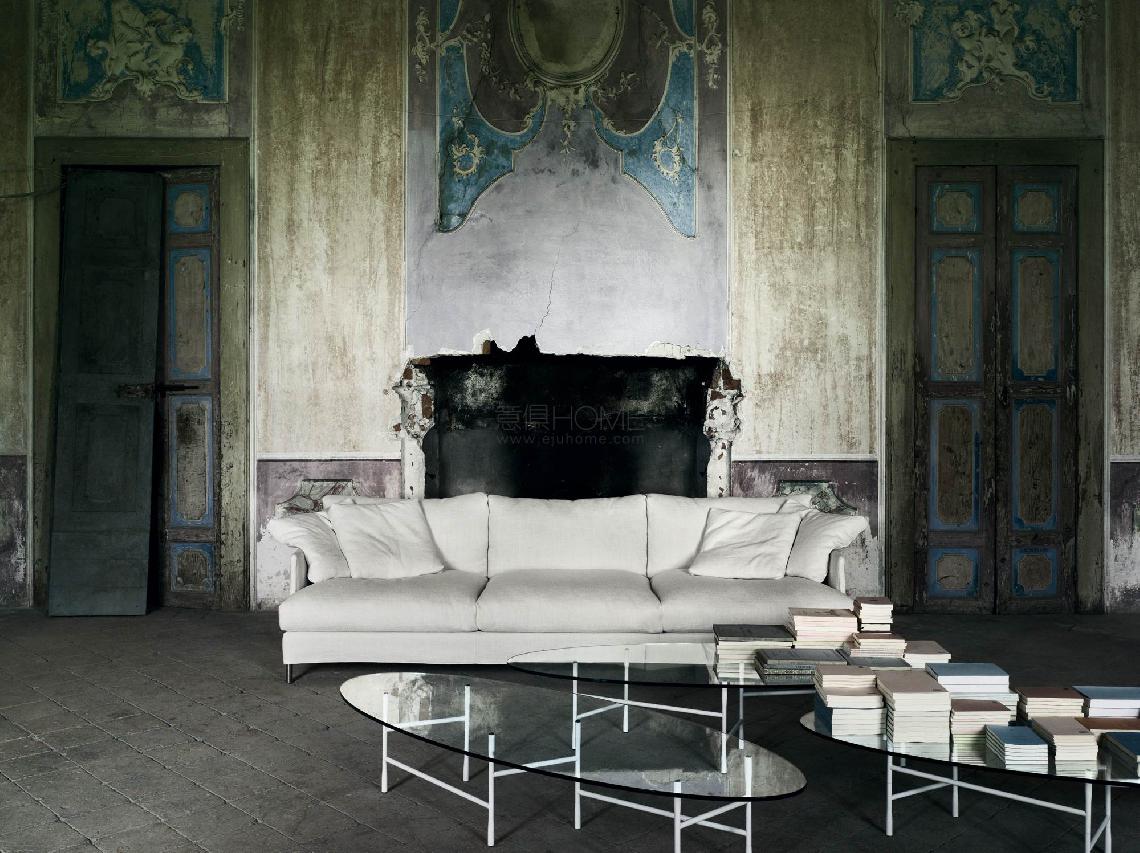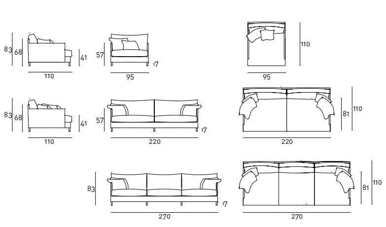 Fix or modular sofa and armchair. Supporting frame in lacquered  drawn tubular steel. Seat chassis in fir wood, with cross-woven,  coated rubber elastic straps. Backrest and armrest frames  made with a structural elastic material. Covering in 100%  polyether thermally bonded onto a polyamide velveteen backing.  Seat and backrest cushions padding with polyurethane foam insert  coated with prewashed and sterilized goose down, stitched into  separate compartments, or covered with acrylic fibre layers.  Armrest cushions and supporting pillows in prewashed and  sterilized goose down, stitched into separate compartments.  Tubular feet in AISI 304 stainless steel with matt satin-finish,  on request available in natural or ebony-dyed oak. Fabric or leather  upholstery, both fully removable by zippers and Velcro fastenings.  Standard flounce 7cm from the floor for fabric upholstery only,  on request available also without flounce.  The leather version is always without flounce. Seat depth 61-81cm.