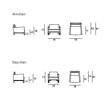 Armchair with backrest frame in double-paneled fir-wood and armrest and seat frame in multilayer poplar wood, padded in polyurethane foam covered with acrylic fiber layers. Seat chassis, inset in the base frame, in solid fir-wood sprung with coated rubber elastic straps; padding in polyurethane foam covered in 100% polyether thermally bonded onto a polyamide velveteen backing. Seat cushions in prewashed and sterilized goose down, stitched into separate compartments, with differentiated density polyurethane foam and Visco-soft insert, and covering in needle punched, resinated, non -woven polyester fiber, bonded onto a polyamide velveteen backing. Backrest cushion in prewashed and sterilized goose down, stitched into separate compartments, with polyurethane foam  insert. Fabric upholstery fully removable by zippers and Velcro  fastenings. Fix leather upholstery for structure only. Tubular steel feet ?30mm for armchair and ?22mm for easy chair, joined by a bracket, with bronzed epoxy powder coating and black PVC tips, or feet in solid wood footprint 50x50mm section for armchair and 40x40mm for easy chair, veneered Stone Oak?, screwed to a tubular steel bracket, painted with matt black epoxy powder. Seat depth 61cm for armchair and 50cm for easy chair.