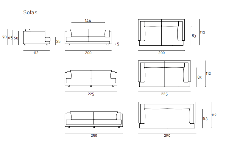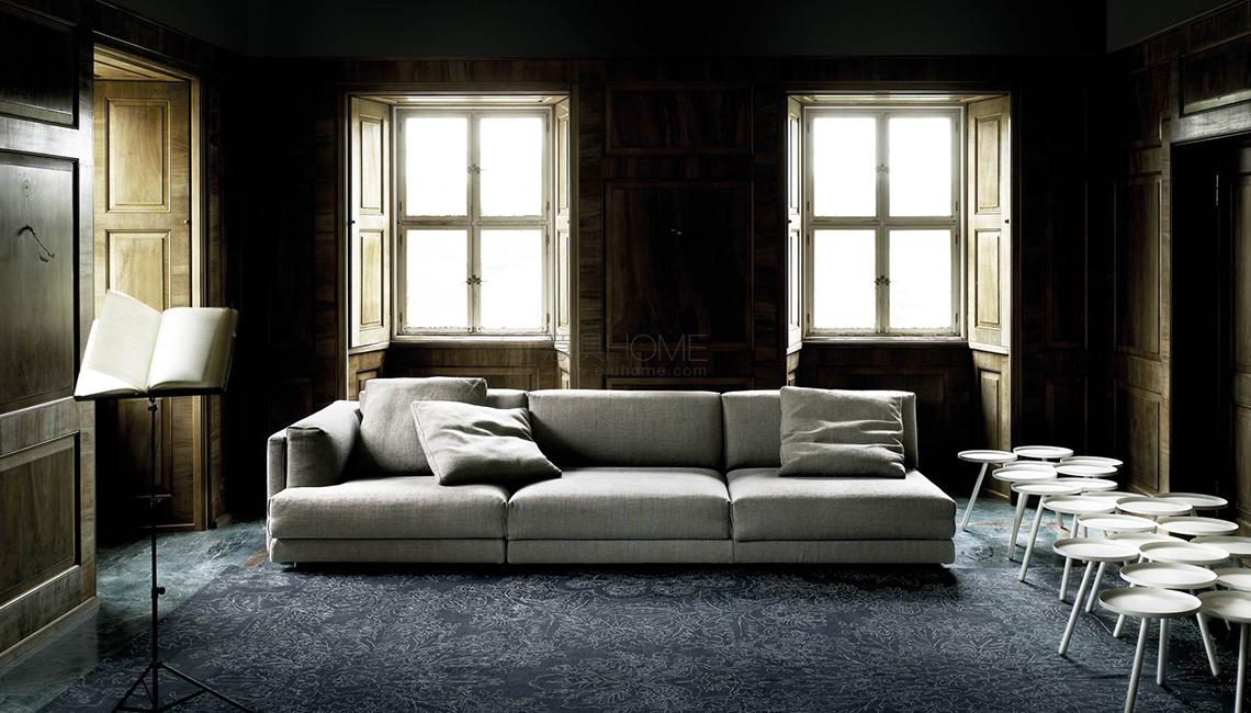 Fix or modular sofa with one-piece frame in double-paneled poplar and pine. Steel seat chassis with support in cross-woven, coated rubber elastic straps. Shell padding in differentiated density polyurethane foam. Covering in needle punched, resinated, non-woven polyester fibre, bonded onto a polyamide velveteen backing. Seat cushions in differentiated density polyurethane foam, coated with acrylic fibre layers. Back and armrest cushions in differentiated density polyurethane foam, coated with acrylic fibre layers, or on request, in prewashed and sterilized goose down, stitched into separate compartments, with preformed polyurethane foam insert. Anodized aluminum black feet, adjustable on three levels, from 7 to 10cm. Fabric or leather upholstery. The fabric version only is fully removable by zippers and Velcro fastenings. The leather version is always with non-removable upholstery. Seat depth 83cm.