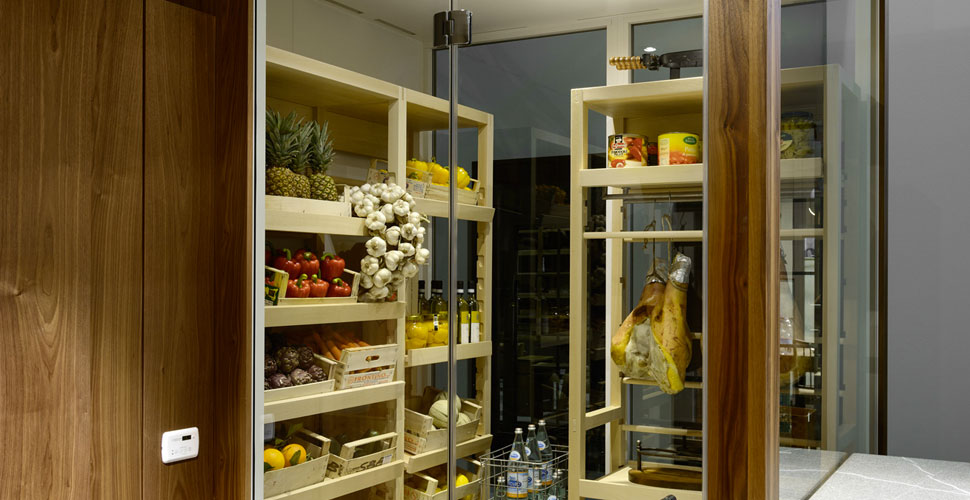 Glass doors highlight the special design of the wine cellar which perfectly creates the necessary conditions inside a wine cellar conceived for the conservation of vegetables, fruits, red wine and cured meats.