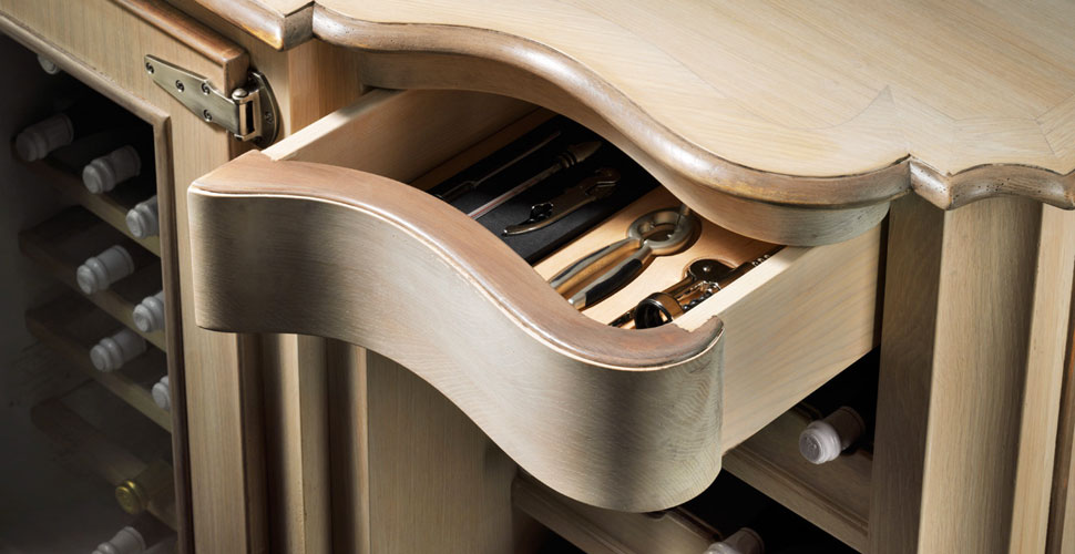 Every detail of Oyster wine cellar has been conceived for the moment of wine or liquor tasting: from aesthetic, to technical equipment and space arranging. The two small wine cellars with independent temperature are completed thanks to side drawers equipped with sommelier tools, while on the top part there is a shaped shelf which could house a pull-out tray for glasses.