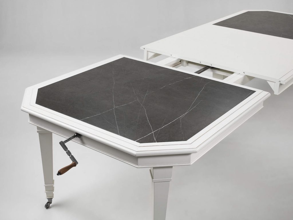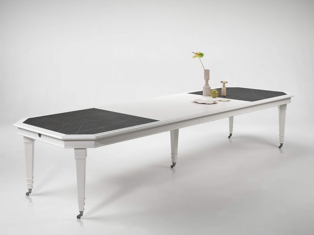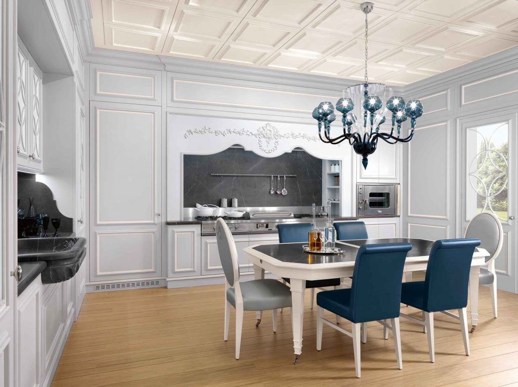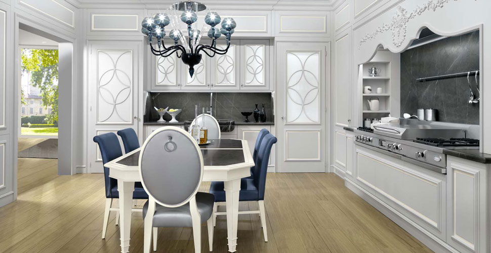 The mix between marble and lacquered surface, the handicraft manufacturing of wood together with the geometrical shape of the legs make Iris and elegant table, ideal to be matched to a kitchen space or a classic and precious dining room, as for Floral kitchen is.