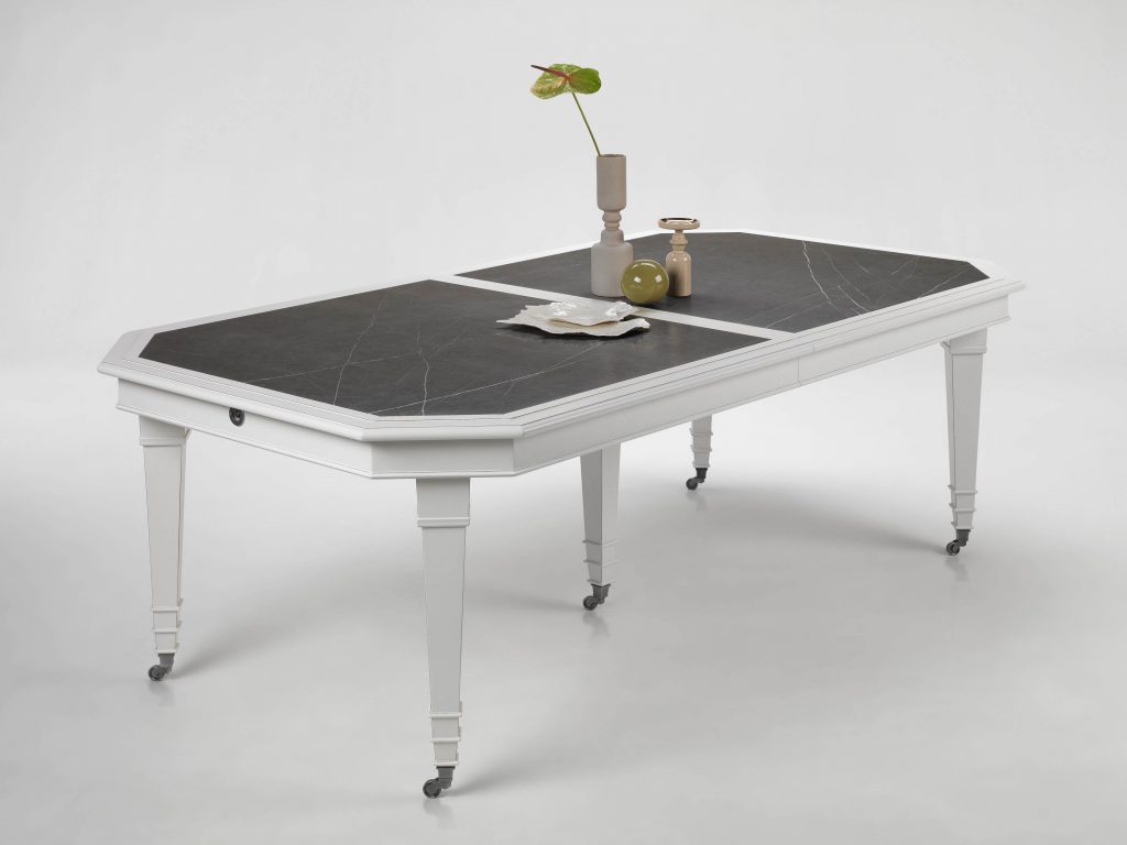 This dining table stands out for its framed top surrounding the marble customizable inserts.