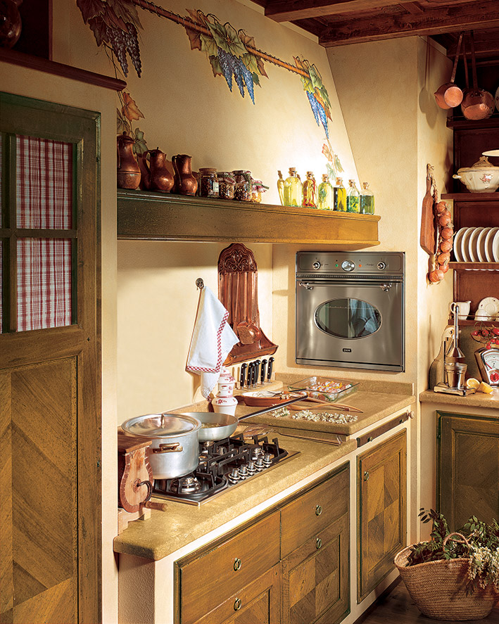 Wood matched with marble, brass or antique iron details and watercolours drawing on masonry elements complement each other in a kitchen of country taste.