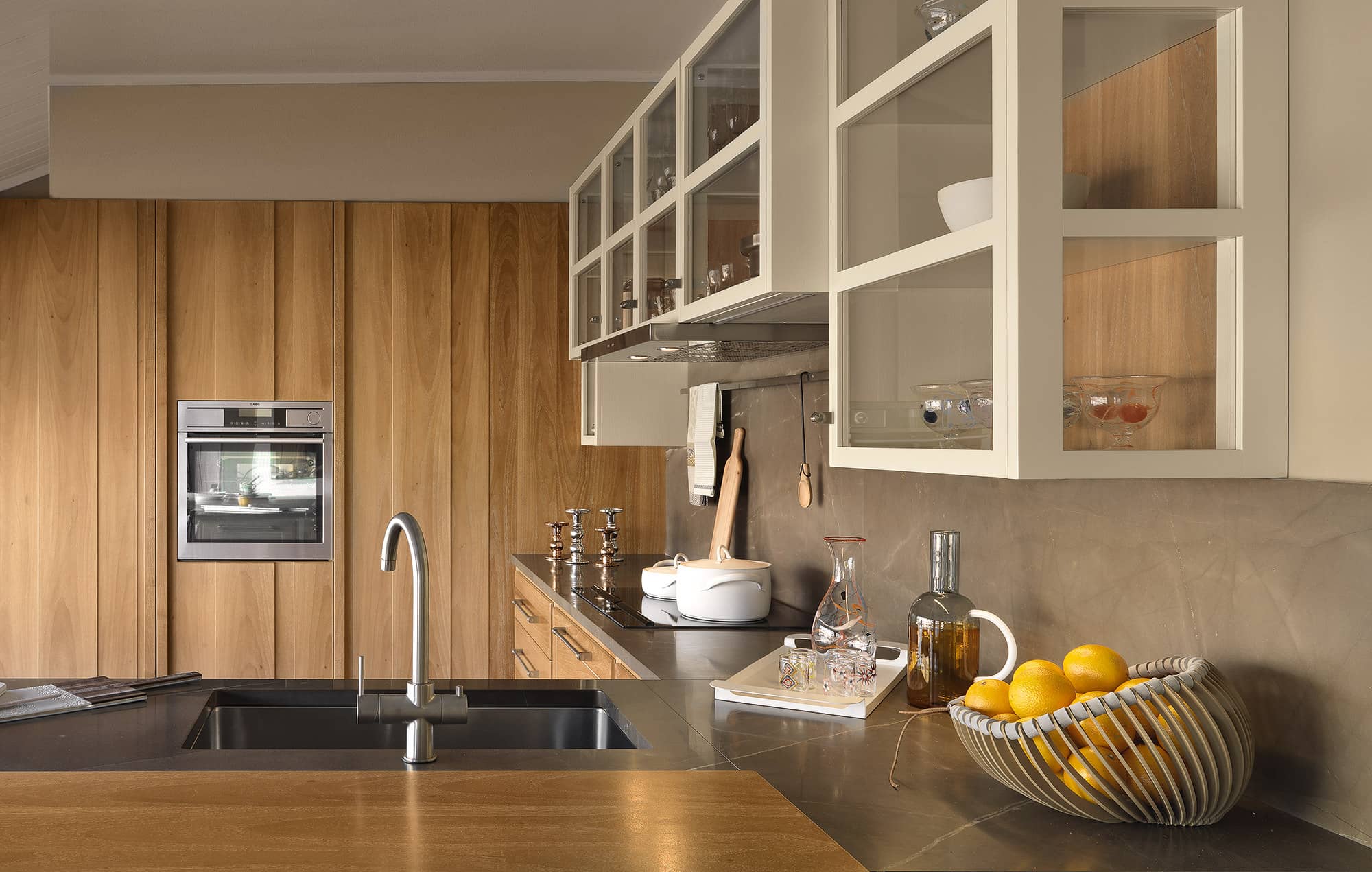 Evita kitchen express its personality through plain shapes and framework structured doors in walnut wood with flush panel. Besides, the complicity of natural walnut enriches its essential design.
