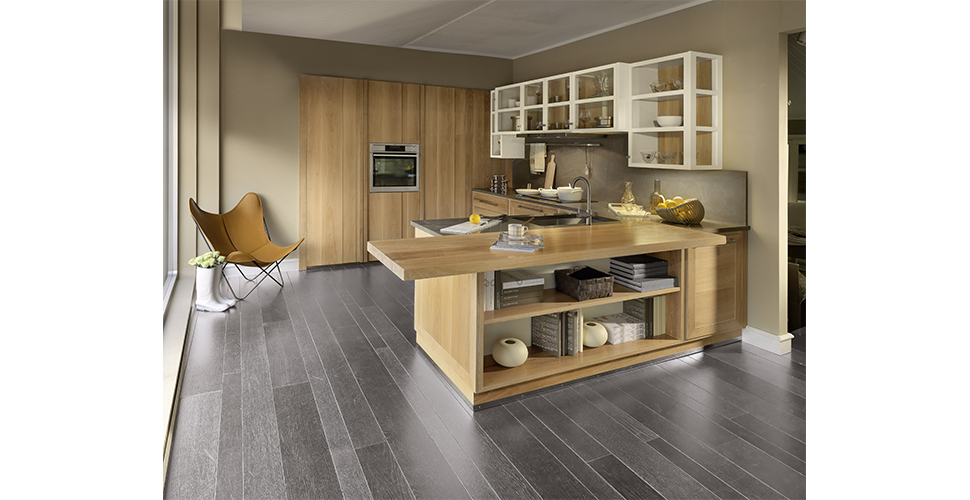 Solid wood, with its tenuous and natural veining, became the protagonist of the simple design of the Evita island or peninsula kitchen recalling fluid and open spaces.