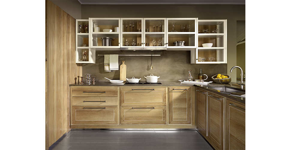 Evita kitchens collections express character and personality thanks to essential and plain shapes enhanced by the handicraft manufacturing of H.D. light walnut.