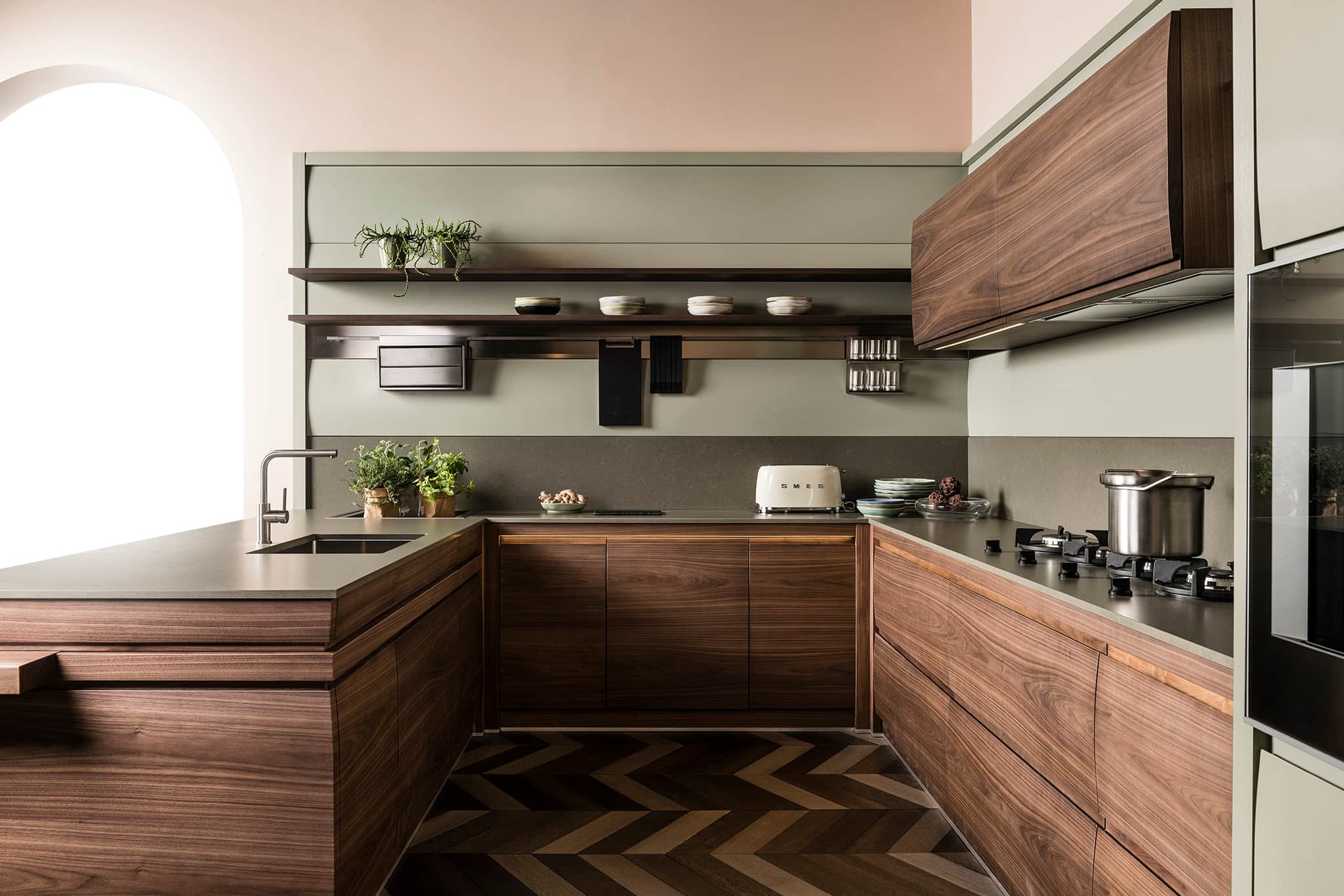 Chronos wall panelling in lacquered solid wood contrasts the colour of walnut furniture creating a unique surface to complete the kitchen and decorate the living space.