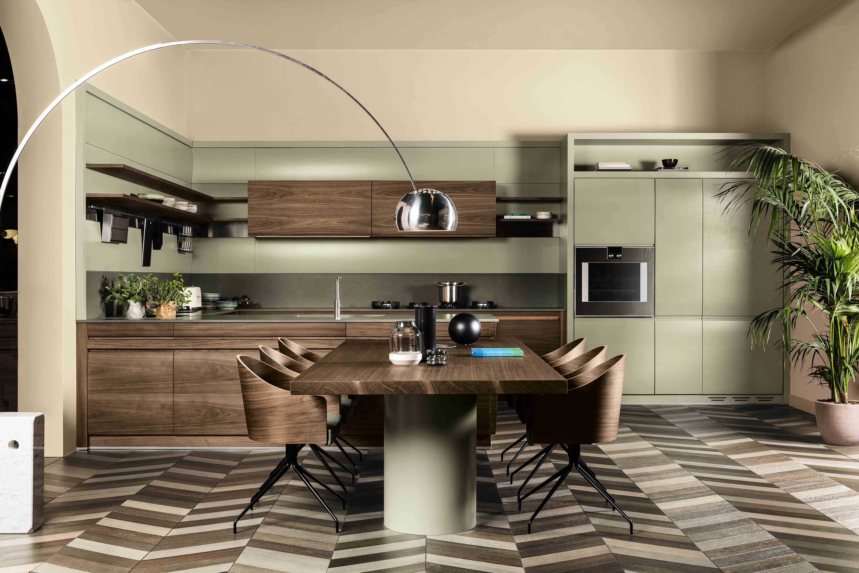 The true protagonist of this contemporary kitchen, characterized by soft and sinuous shapes, is the wood: oak or walnut in natural finishing or, matched to colour shades.
