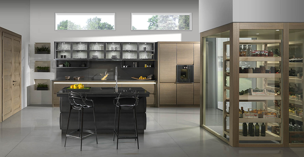 Chronos kitchen, conceived to meet any aesthetic or functional need thanks to the central island or the peninsula element fully shows its eclecticism through tailored solutions designed for the different spaces of the house.