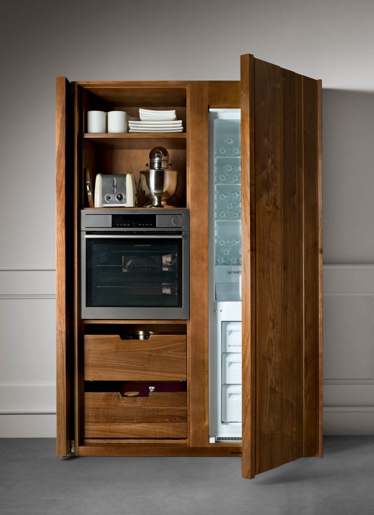 Canaletto kitchen could be matched with 3.75 storage system: the doors of the wall cabinets and tall units are realized through three different dimensions boards with three different depth dimension assembled in an irregular system.