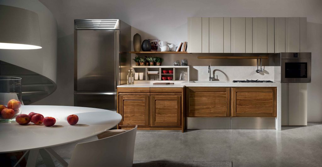 Wooden framework doors, realized with integrated opening handle, enhance the contemporary spirit of Canaletto kitchen highlighting Italian manufacturing.