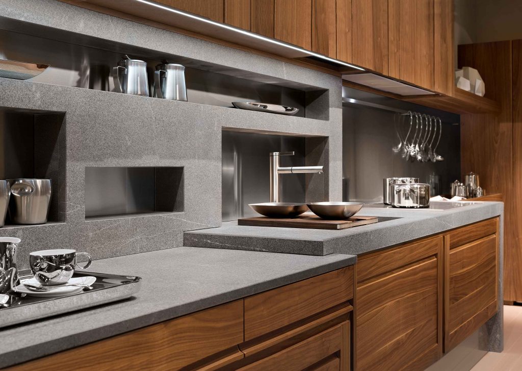 The shuttered doors in walnut are 3 cm thick. Strengthen and solidity meet embracing material effect celebrating kitchen excellence.