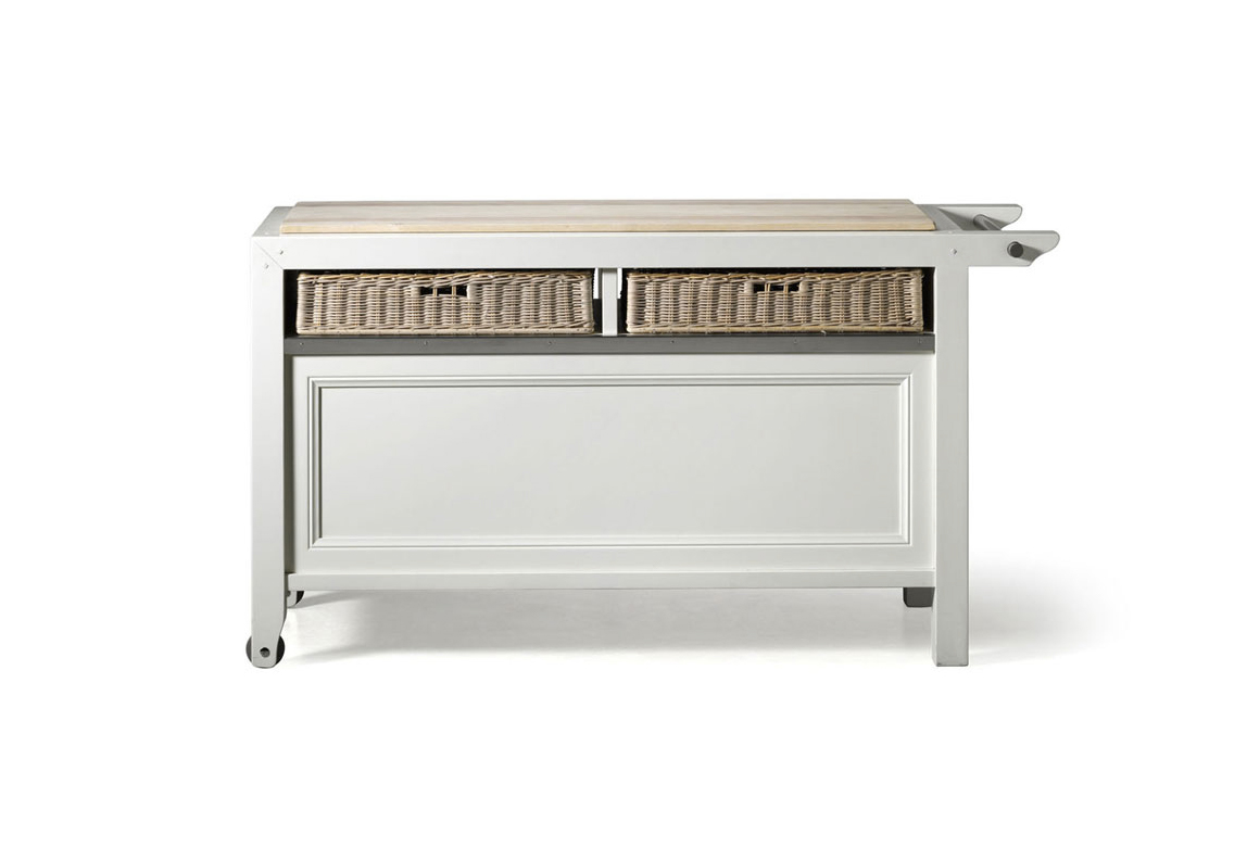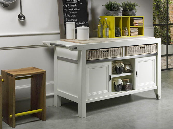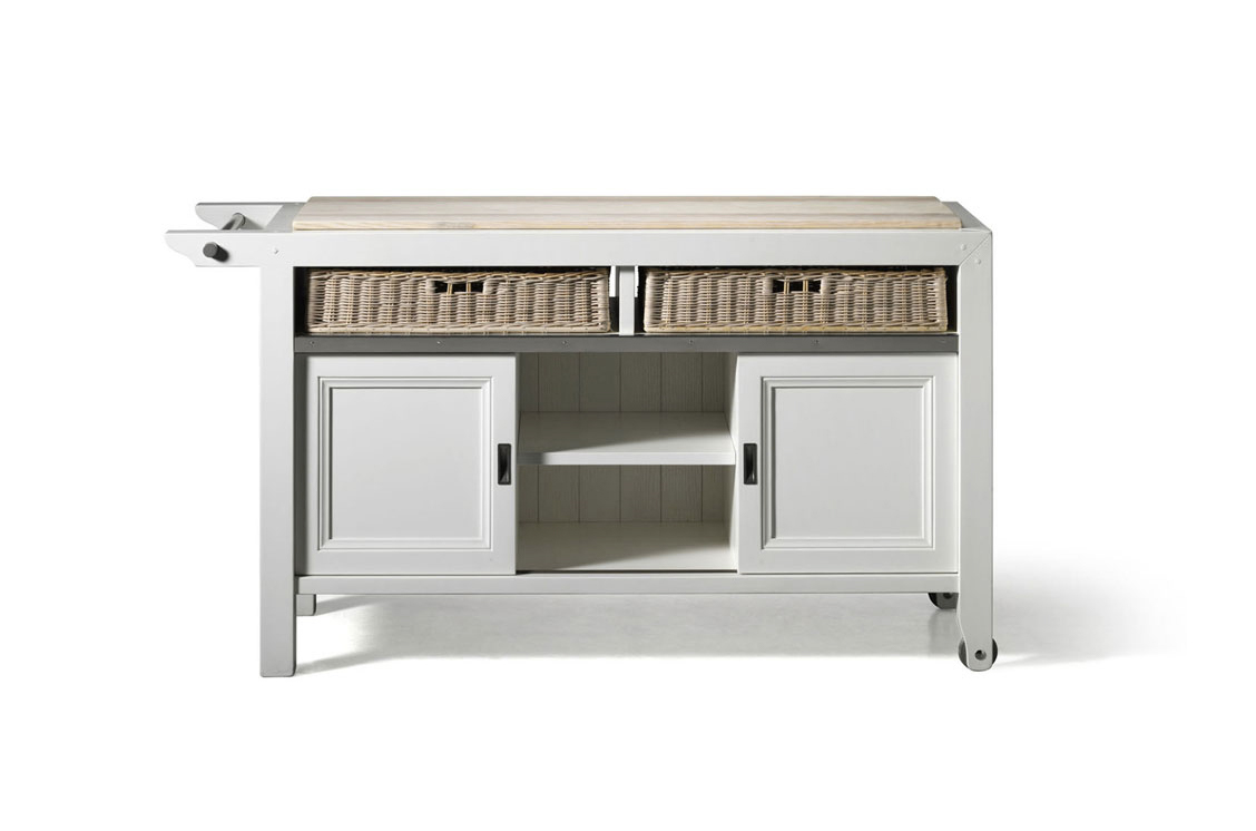 Rotella is a complementary furniture item used as a sideboard with lines that are reminiscent of workbenches. Simple in shape but sturdy, Rotella is fashioned from lacquered cherry wood and is fitted with two simple wooden wheels and a end bar handle which makes it easy to move.
