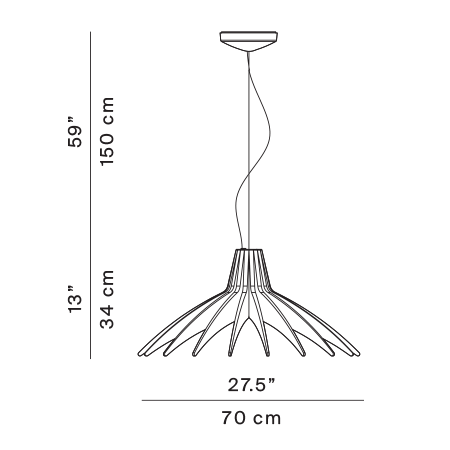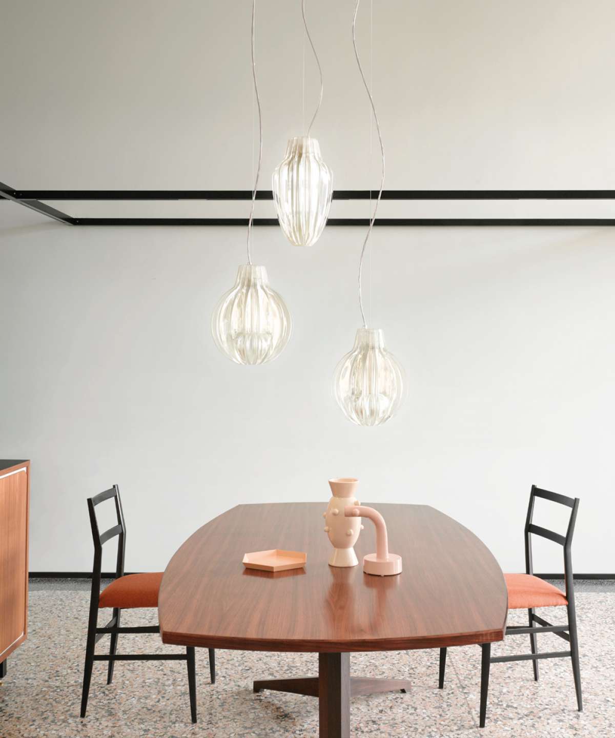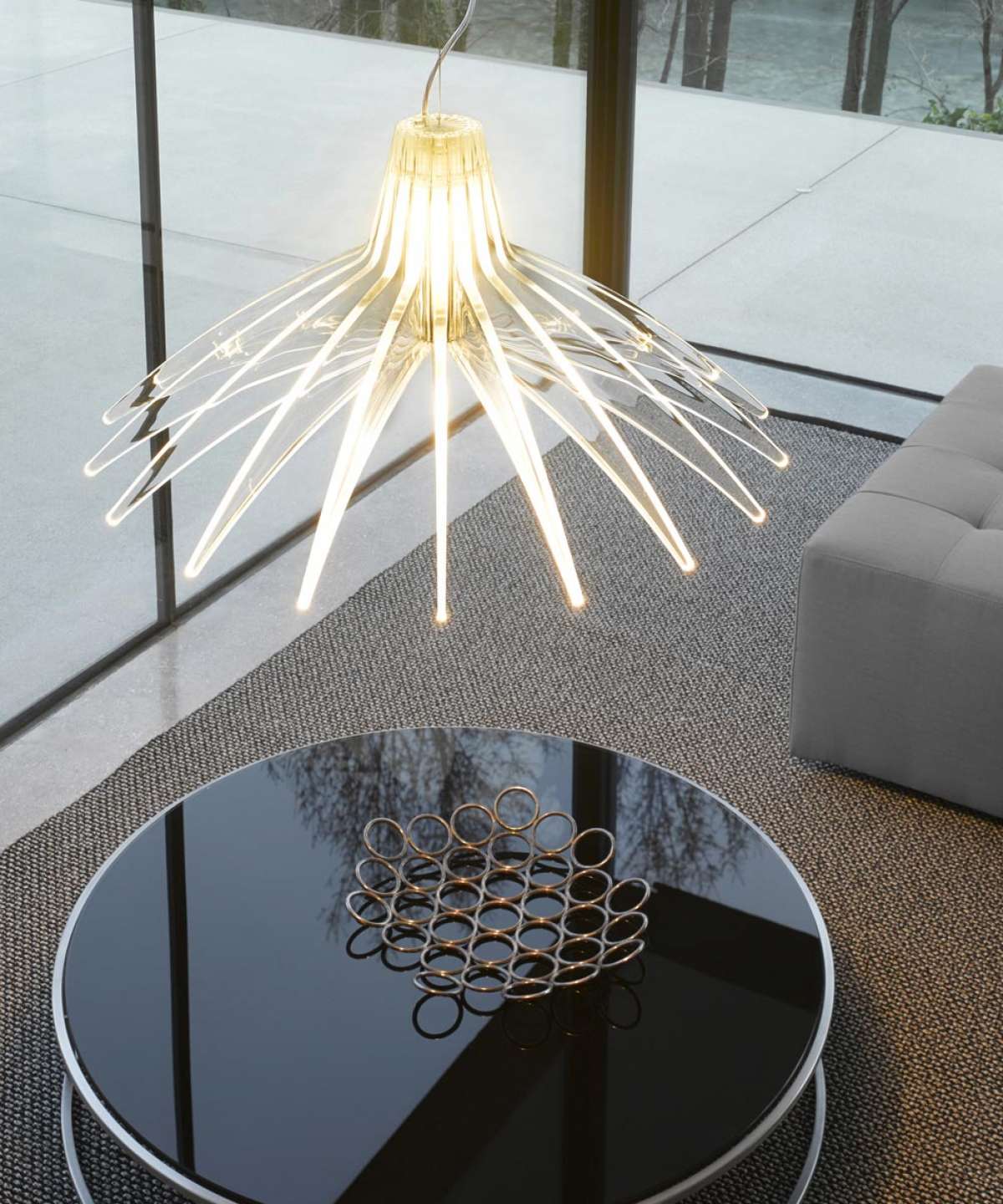 A game of transparency, reflection and refractions generates light with vivid visual impact. Three special filters can be superimposed to create chromatic effects. The radial structure of the transparent methacrylate ribs conceals the light source, preventing glare and light dispersion.