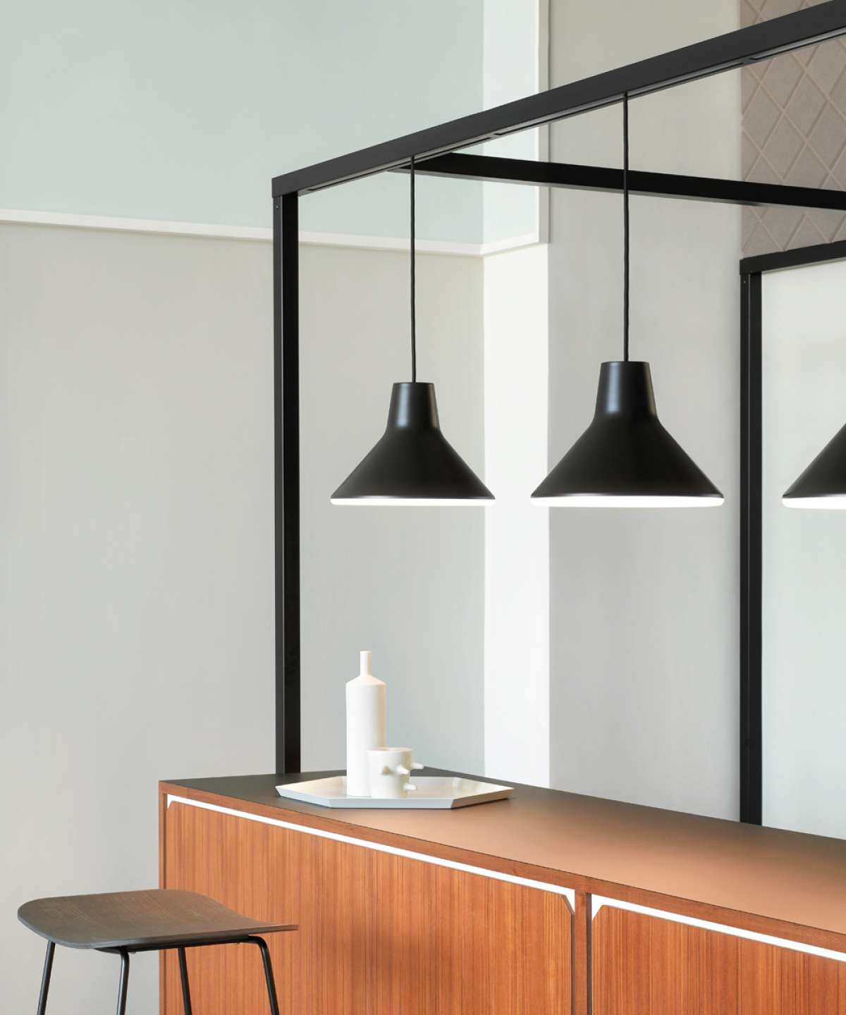 A suspension lamp with a Fifties silhouette. Designed by the Danish studio Goodmorning Technology, it suggests the emblematic formal rigor and functional minimalism of the legendary Danish Modern tradition. A timeless classic that combines high technology and innovative light diffusion with simple lines and clean forms, ideal for both classic and modern settings.