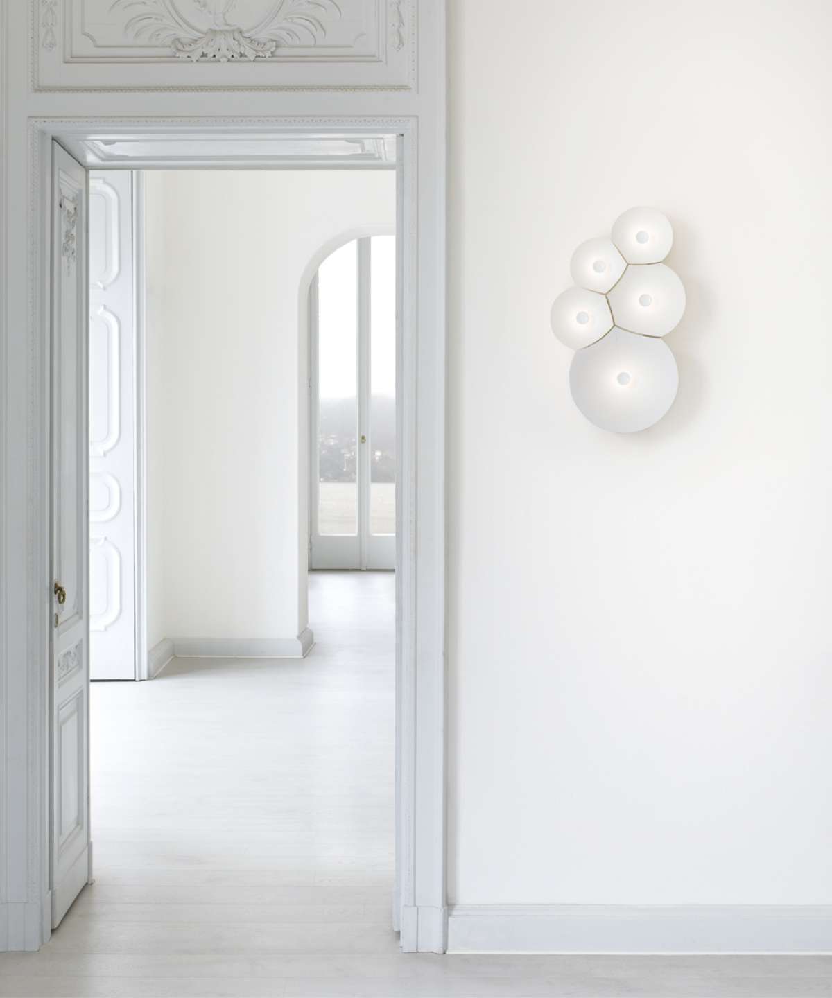 A series of parabola of different sizes intersect to generate the characteristic geometric form of soap bubbles; conical, broad and flat shapes, each composed of a silhouette in white polycarbonate, slightly bent to take on a structural nature. Each bubble has a light source at its center: it contains the core of the lamp, and thanks to built-in dimmable LEDs spreads appealing, soft light that is reflected towards the inside of the cone.