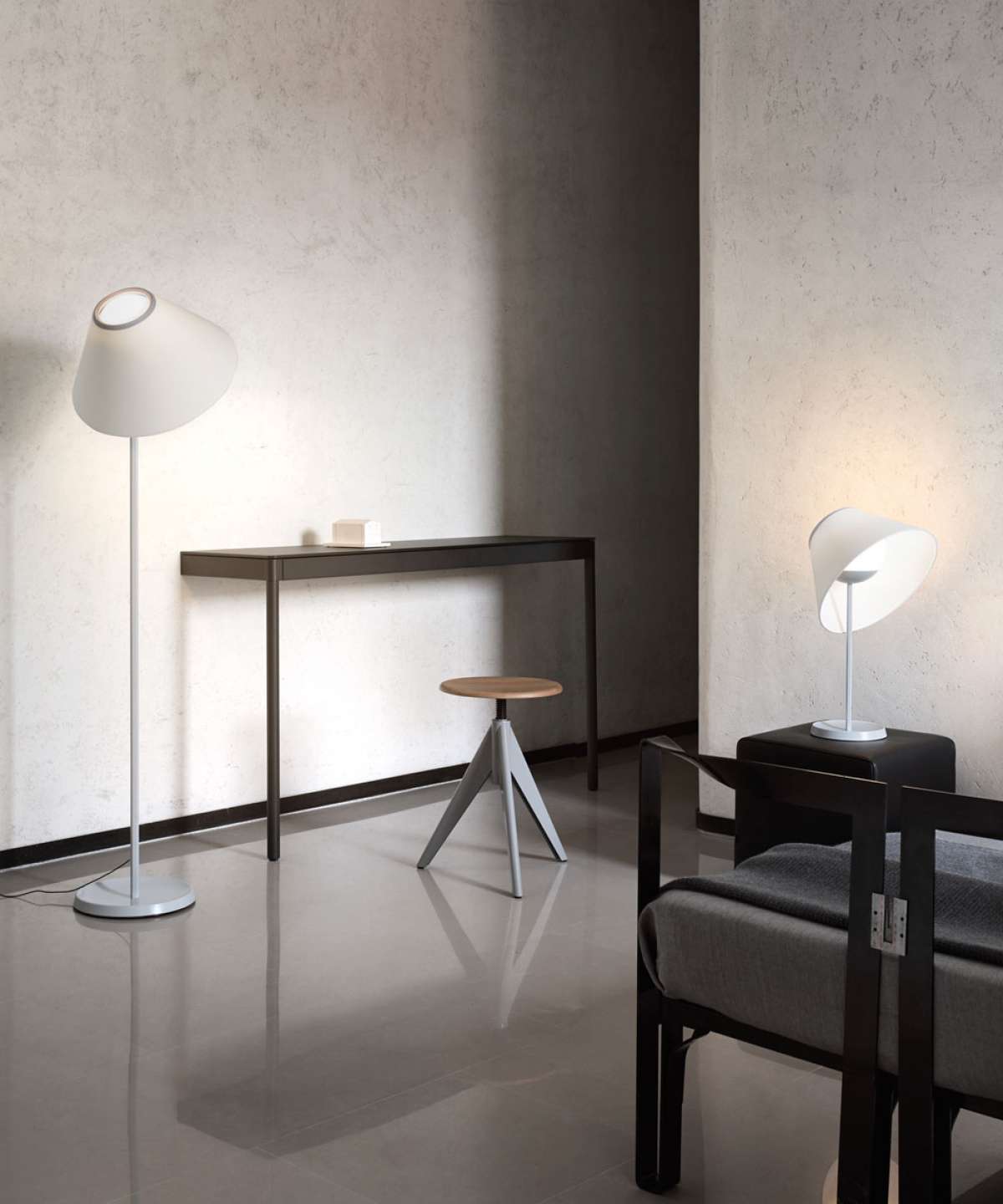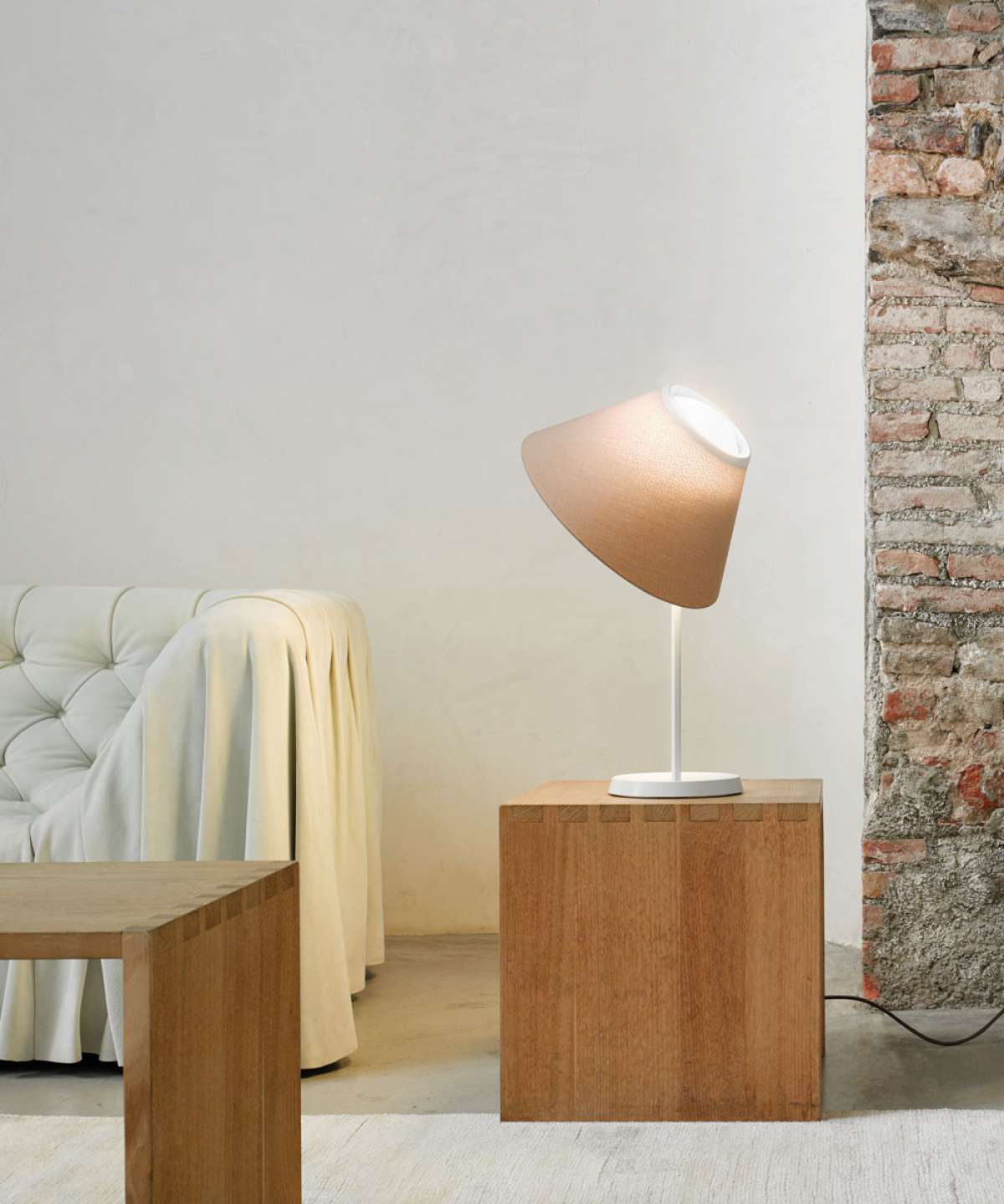Cappuccina also comes in a suspension version. Two sizes for the shade and three color combinations are available for all the models, giving rise to lamps that are very different from one another. Also in this suspension version, the shade can be freely adjusted in space with a simple gesture.