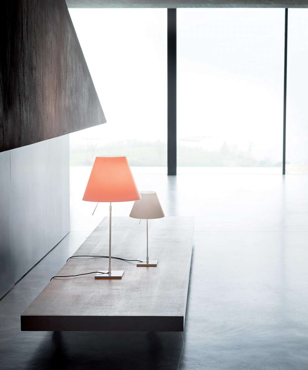 Elegant and light, this lamp emits a pleasant warm light through a silk-screened polycarbonate shade. The lamp’s height may be adjusted by means of a characteristic steel counterweight.