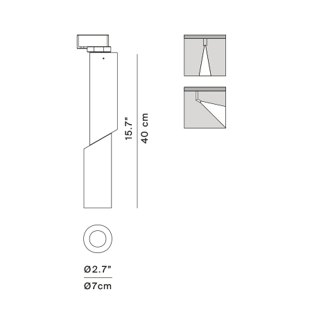 A family of adjustable fixtures with cylindrical housings. Two possible installation modes, on the ceiling or on a track. Light can be directed where it is needed. The jointed form makes for intuitive use, generating an intriguing architectural image.
