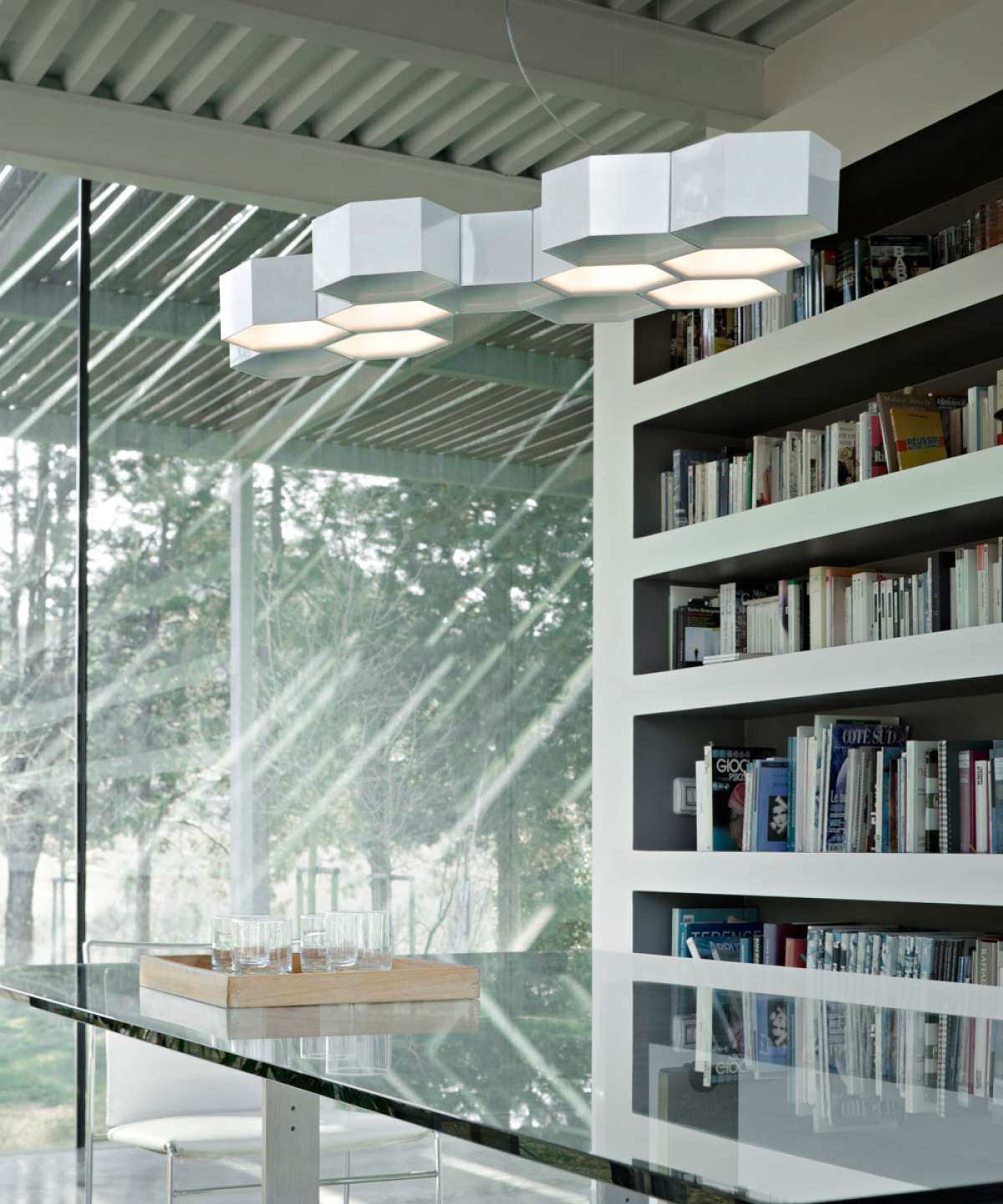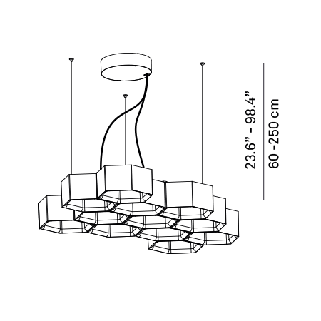 Like the cells of a beehive, the hexagonal modules of Honeycomb are freely grouped in a suspension lamp of captivating organic symmetry. The hexagons, connected by clips, form a self-supporting structure to contain energy-saving halogen and LED sources, for direct and indirect lighting.