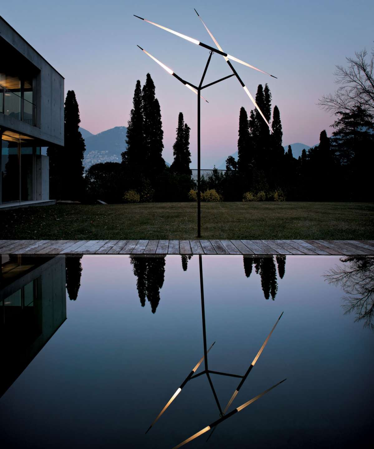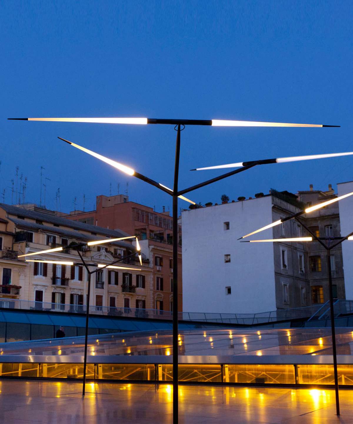 The outcome of innovative research carried out by Studio Odile Decq, this evocative lighting fixture dedicated to the extension project of MACRO– Rome’s Museum of Contemporary Art – has an aluminium body with conical satin-finished methacrylate tips that shed suggestive light from LED sources.