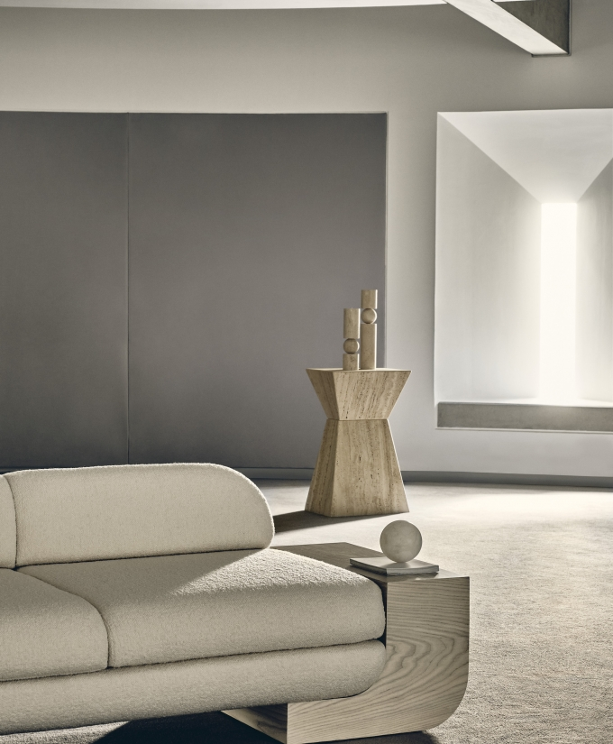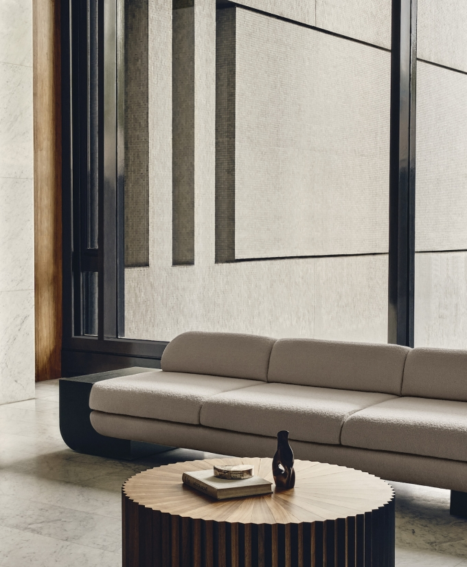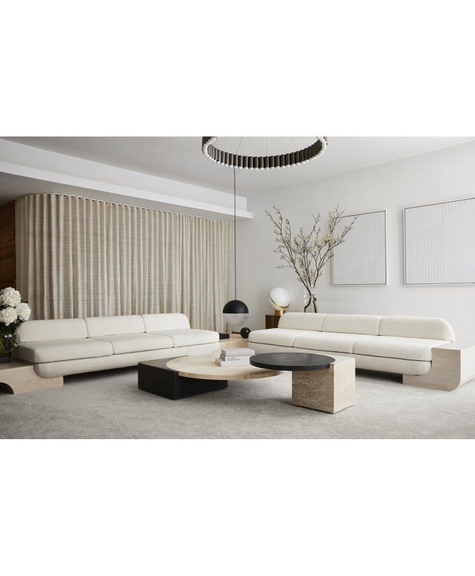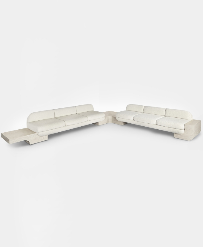 The White Street Sofa highlights Lee Broom’s long-held fascination with symmetry and seamlessness. This architectural, streamlined, modular piece can be arranged in multiple configurations and is effortlessly connected by sculpted armrests, corner or side tables, each produced in black or white ash. Shown in a sumptuous ivory bouclé by Dedar, but available in multiple colours, the sofa, with its expansive and curved back, appears to float, anchored only by its connectors. The White Street sofa is available as a two seat, three seat and corner configuration sofa.
