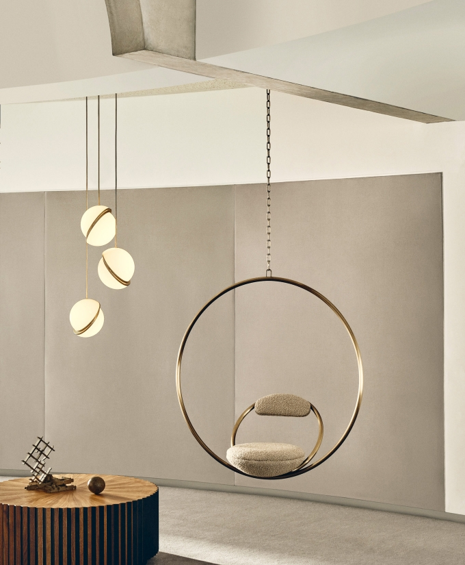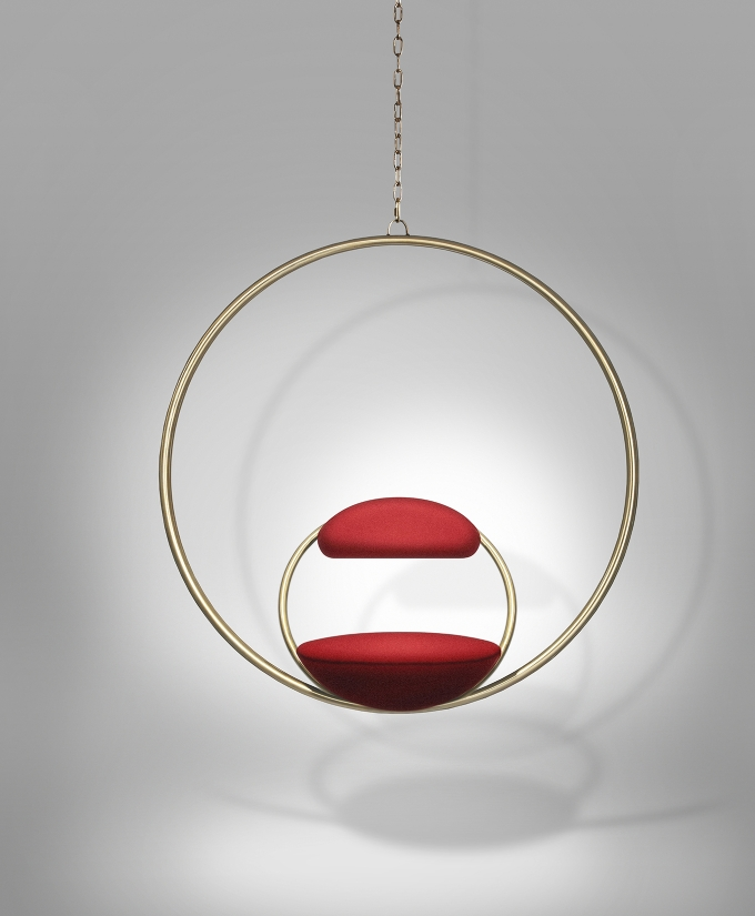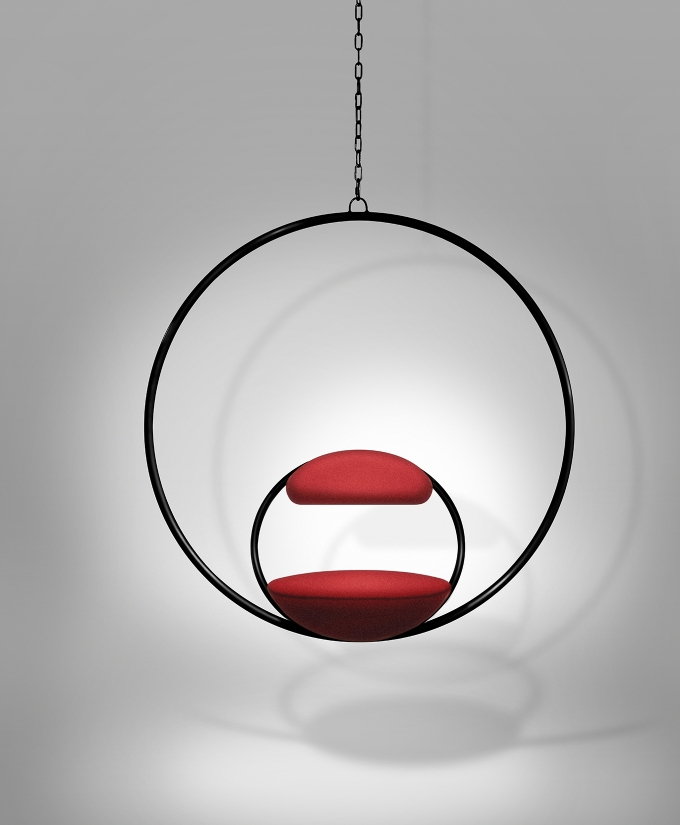 Suspended from above, two black powder coated steel circular hoops join to create the Hanging Hoop Chair, with a seat and backrest upholstered in Kvadrat wool.