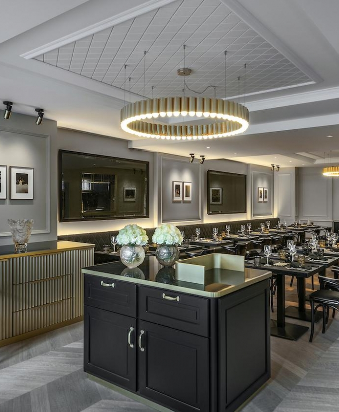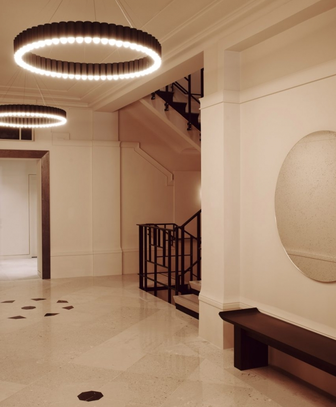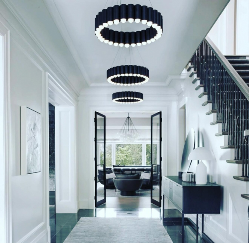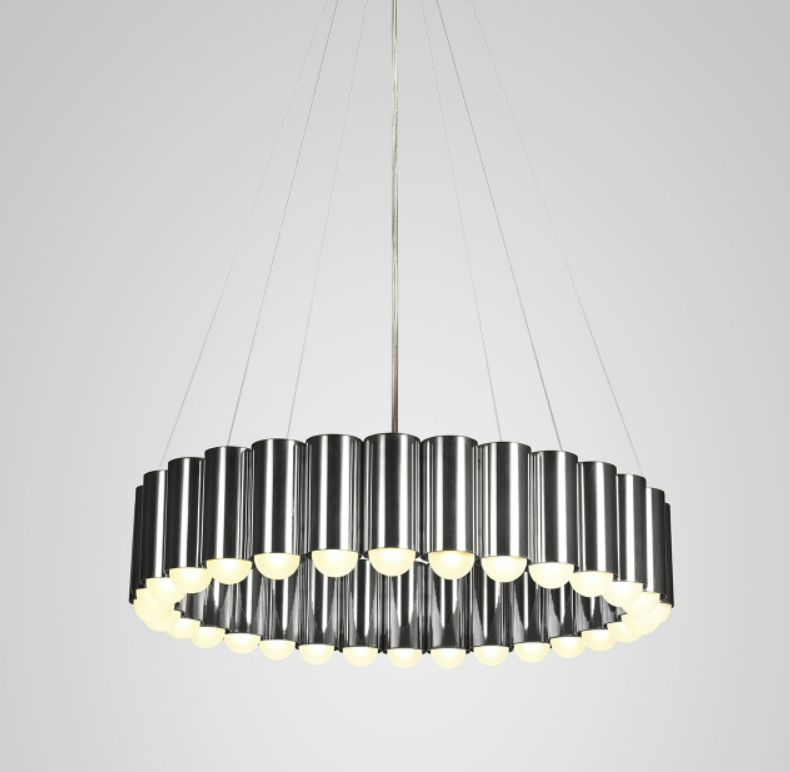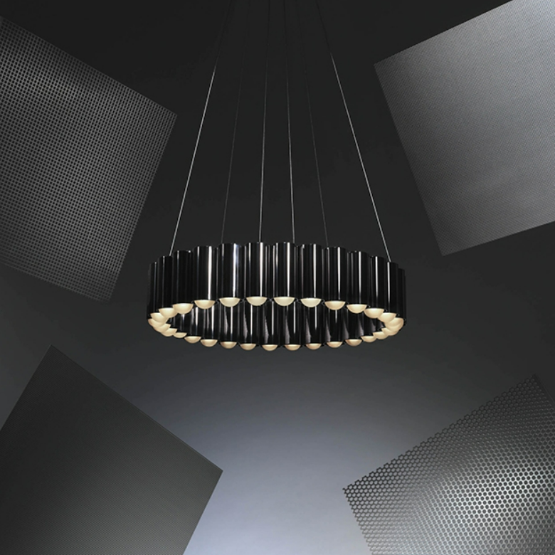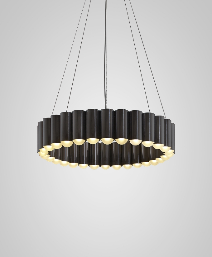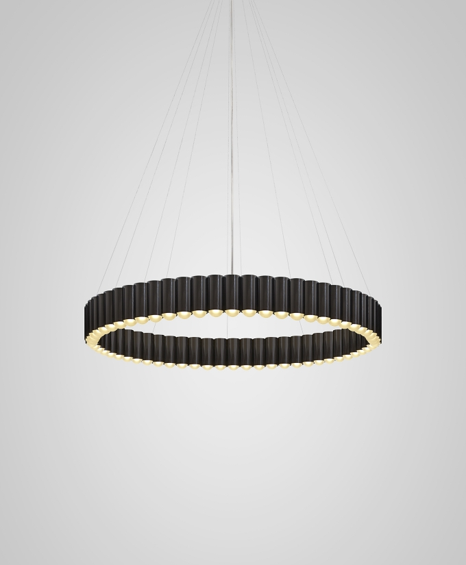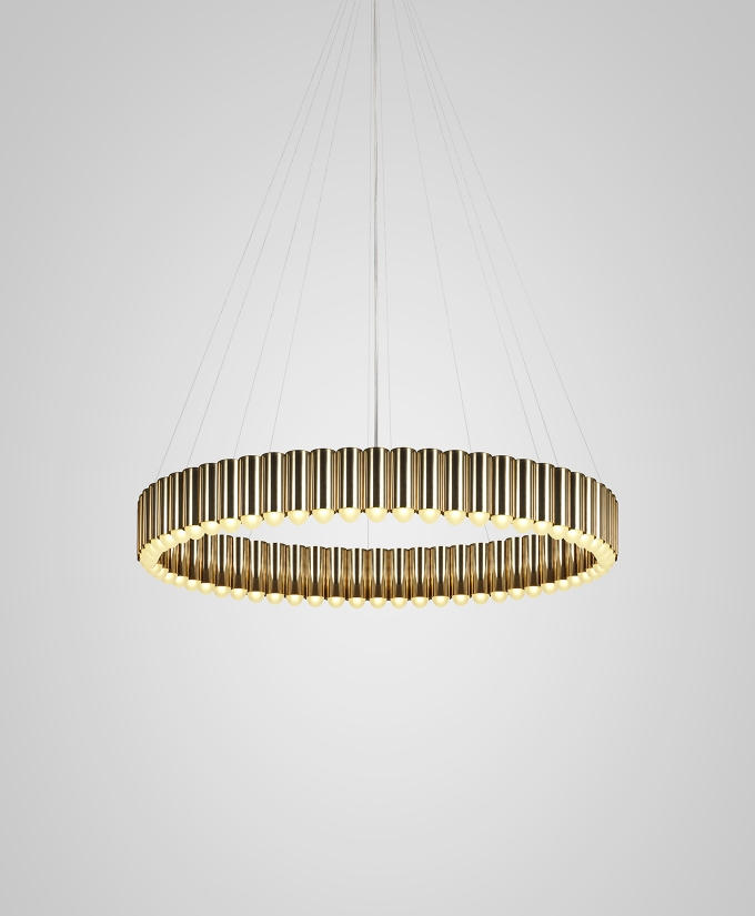 Inspired by the merry-go-round ride of a traditional British fairground, Carousel is a pendant light with a heavyweight presence that floats gently in space. Cylinders of gold, chrome, gunmetal or black each house an inset LED lighting element resulting in a spectacular yet playful ring of light. Carousel is suspended from a matching finish circular ceiling plate by steel suspension wires with a single clear cable.