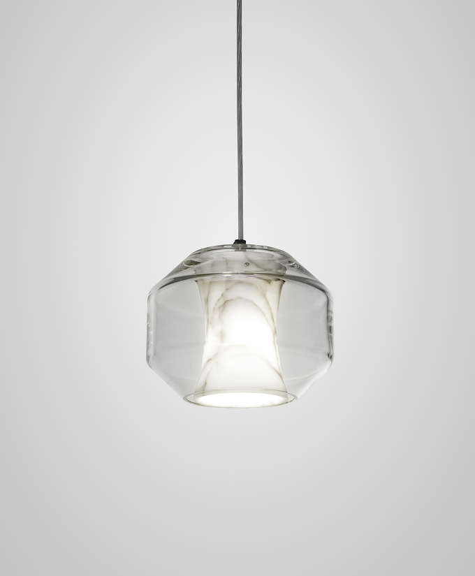 Housing a sculptural Carrara marble diffuser within a lead crystal vessel, Chamber expresses the unexpected translucent qualities of marble in a compelling decorative pendant. With its gentle luminosity and directional downlight, Chamber is available in two sizes & lends itself to being hung in clusters as well as individually.