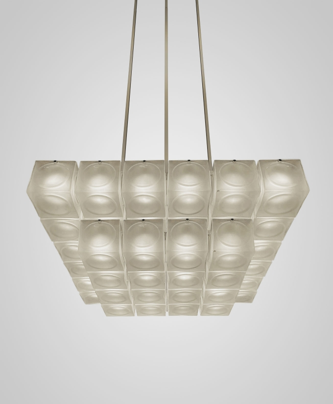 Inspired by the pressed glass bricks often used as an alternative to stained glass in places of worship during the 1970s, Chant is formed of blown glass cubes with a pronounced circular detail in either clear or frosted glass. Constructed in square configurations, the glass cubes connect to form glowing brick-like chandeliers in single or two tiers.
