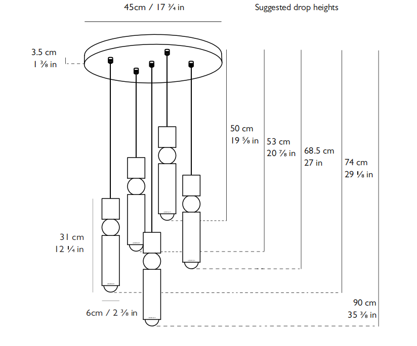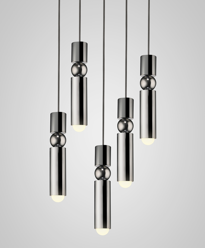 The Fulcrum Chandelier features five Fulcrum Lights suspended at set lengths from a matching finish ceiling plate and creates a dramatic cluster that is simple to install.