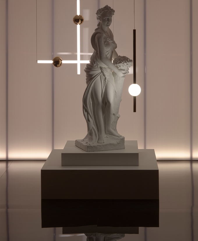 Orion comprises simple modular lights with opposing opaque and solid polished gold spheres along with opaque and solid polished gold tubes. These connect and expand horizontally and vertically to create bespoke constellations of light with infinite adaptations.
