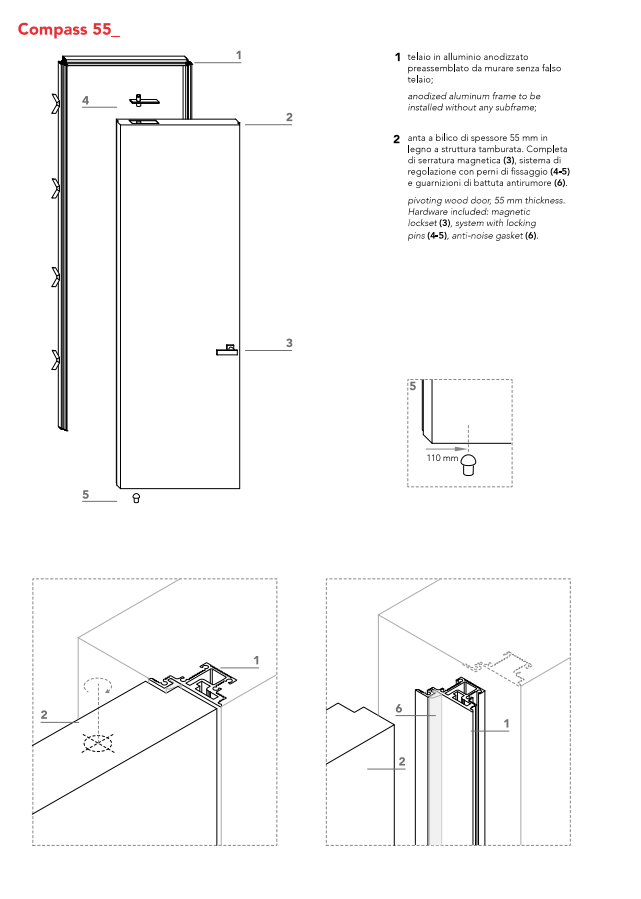 Pivoting wood door 55 mm thick. Magnetic lockset, system with locking pins and anti-noise gasket. Anodized aluminium frame to be installed without any subframe.