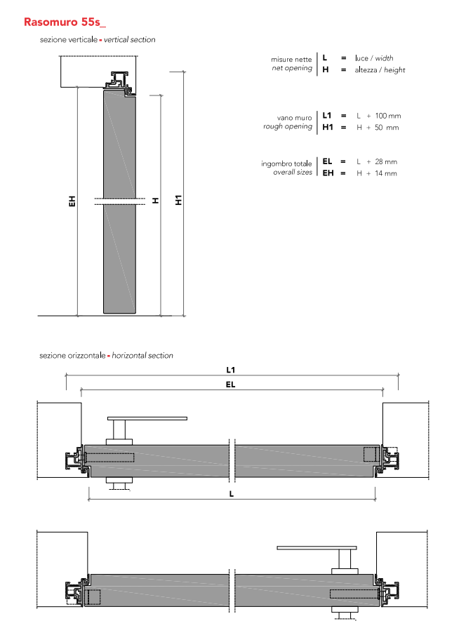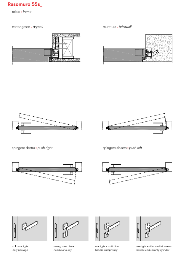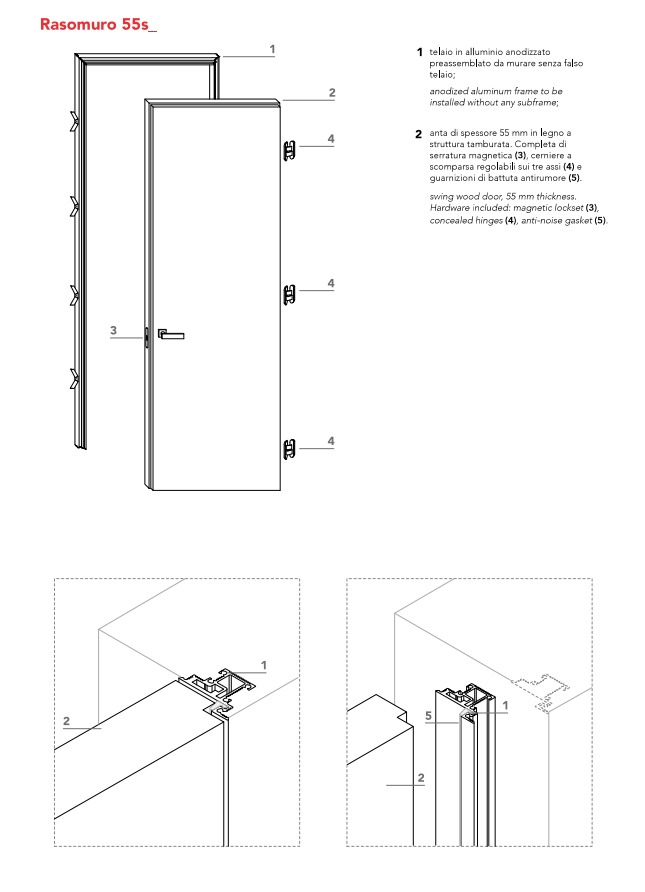Swing wood door, or glass door with aluminium frame, 55 mm thick. Magnetic lockset, concealed hinges and anti-noise gasket included. Anodized aluminium frame to be installed without any subframe.