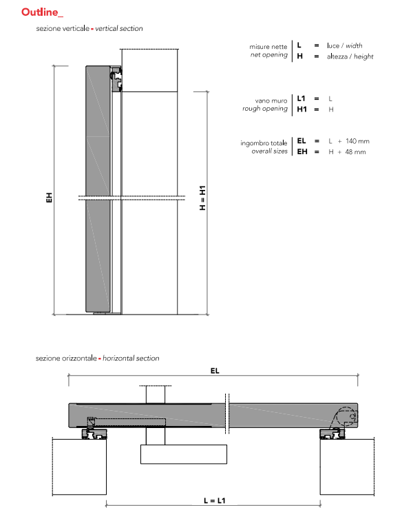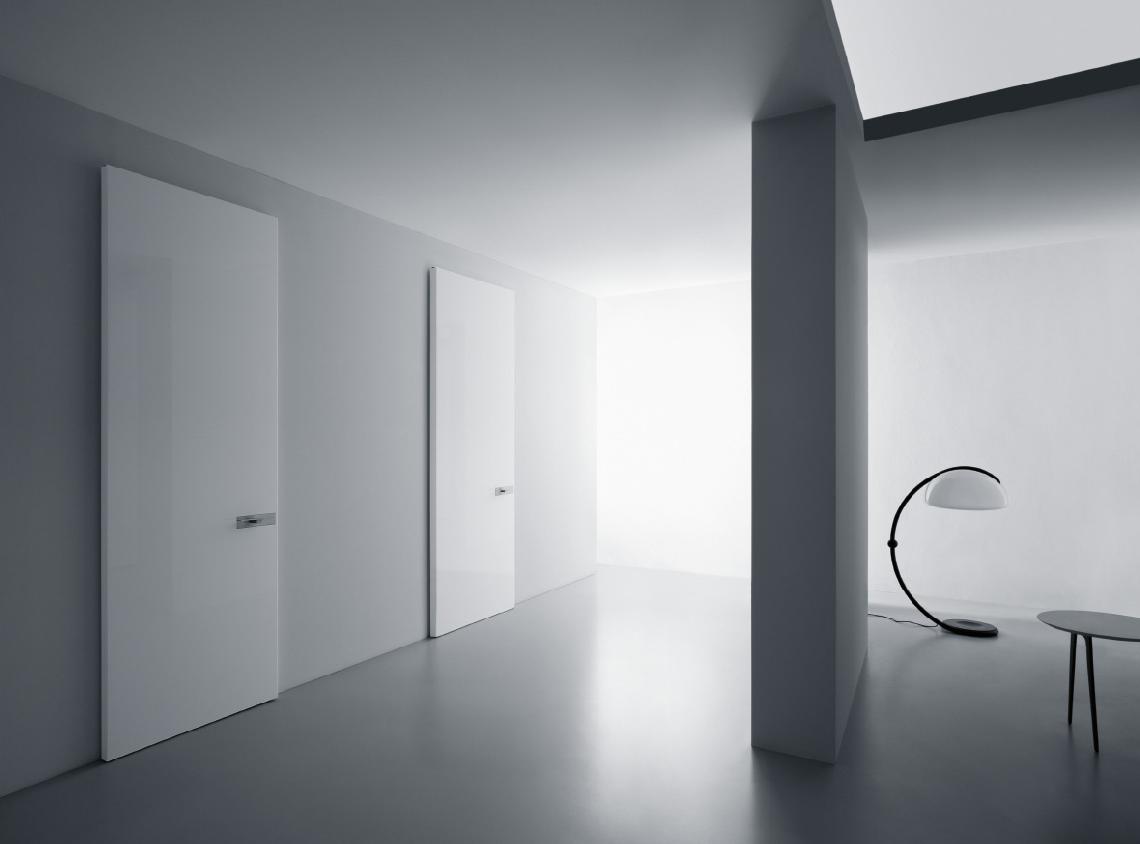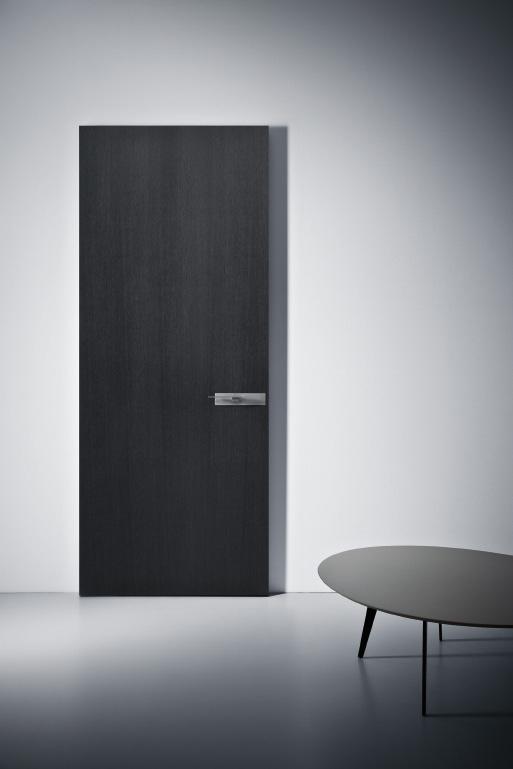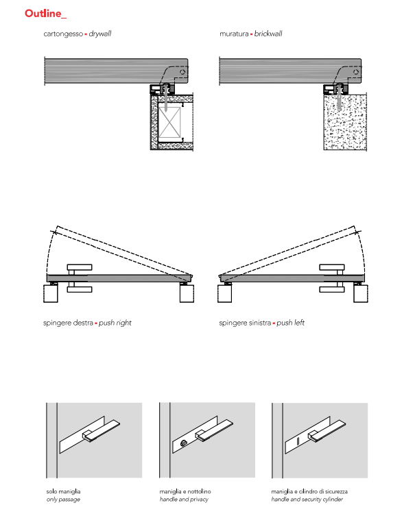 Swing wood door 45 thick. Mechanical lockset, concealed hinges and anti-noise gasket included. Aluminium frame for direct wall installation. Installation on pre-squared wall.