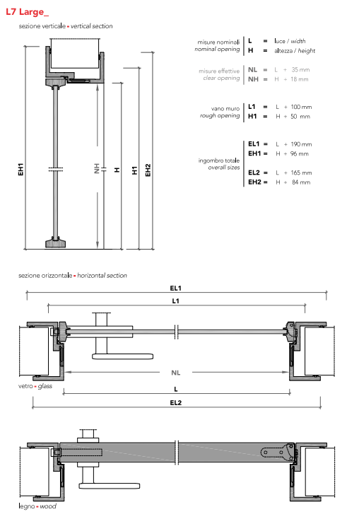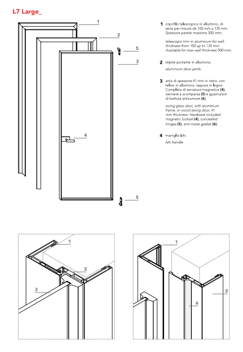 41 mm thick door in glass, with aluminum frame, or in wood. Complete with magnetic lock, concealed hinge and anti-noise stop gaskets. Standard aluminum telescopic wire cover for sizes from 100 mm to 135 mm; maximum wall thickness 500 mm.