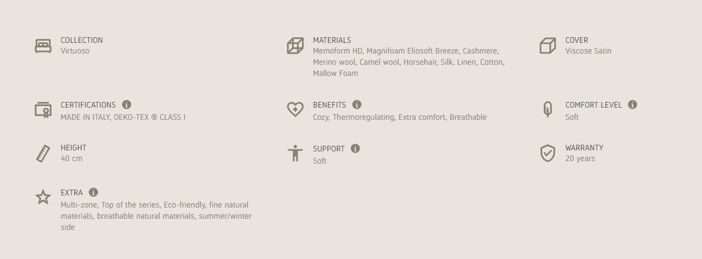 Virtuoso 16 of the Virtuoso collection is simply the best a mattress you can find. The mattress is made of fine materials, elegant fabrics and unique natural fibers. The high-density inner layers provide an exclusive comfort and soft support. All at 40 cm of height.