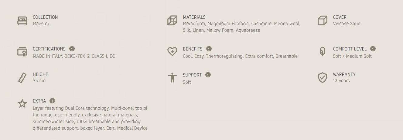 Maestro Dual 14 combines the excellence of traditional materials with the innovation of new technologies to create a timeless elegance and comfort. The natural fibers combined with the inner layers offer a soft and cozy comfort in 35 cm of height. The Dual Core technology provides perfect comfort without compromise.