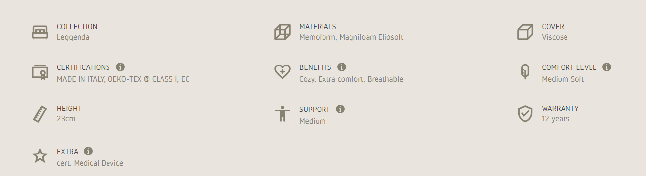 Amabile 9 of the Leggenda line seduces you thanks to the remarkable breathability of the Viscose fiber, which ensures a constantly cool sensation to the body. Wereas Memoform, provides a pleasant sensation of wellbeing and lightness throughout the night.